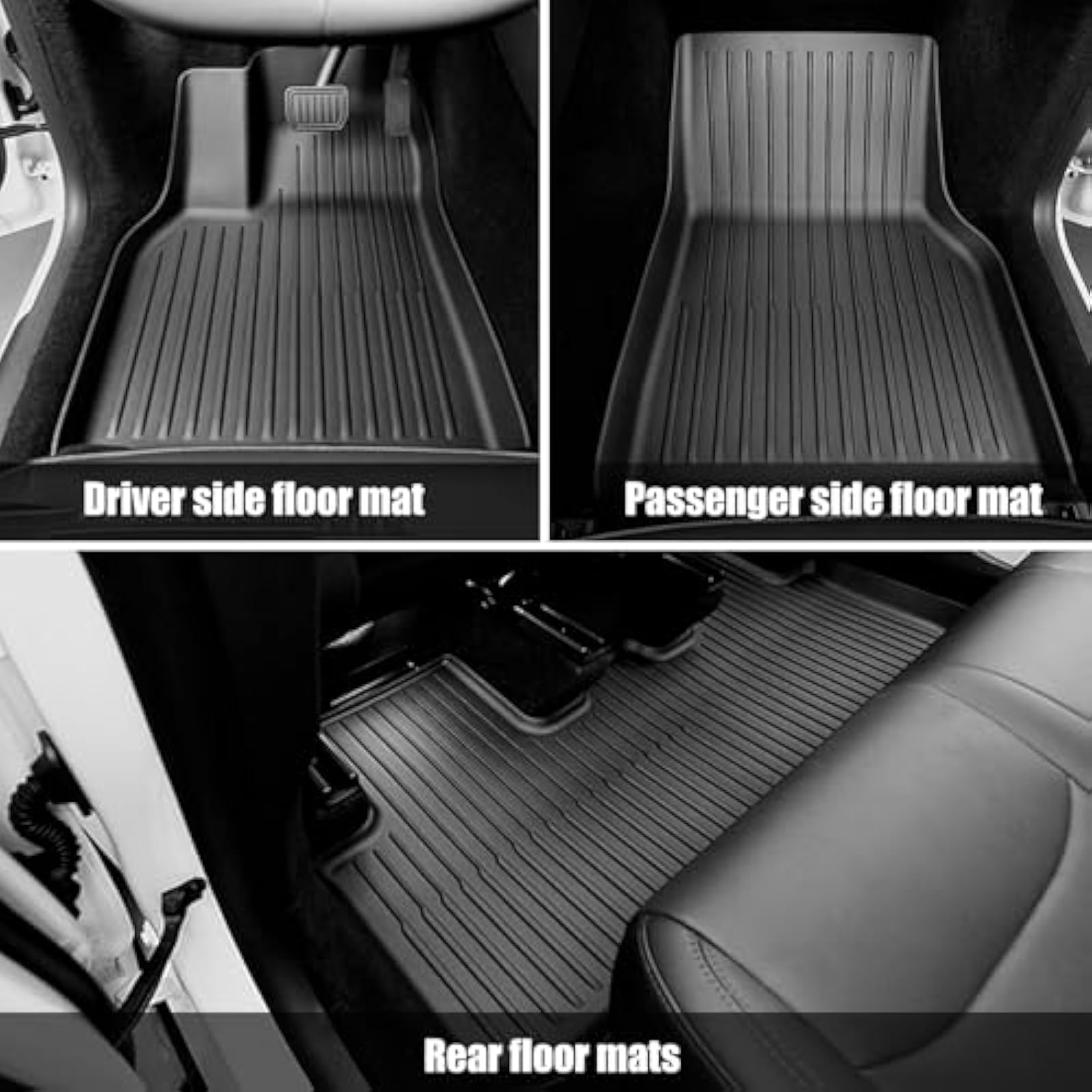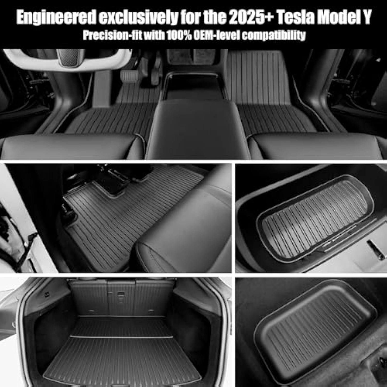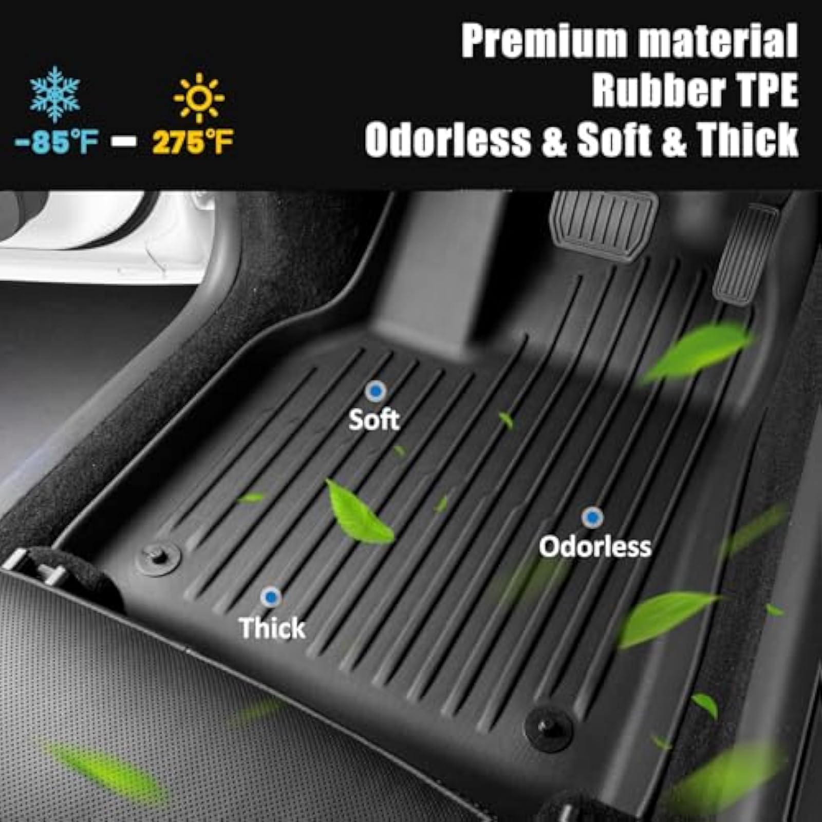 MOST APPROPRIATE MATERIAL: for Tesla New Model Y 2025 accessories floor mats cargo mat with backrest mat constructed from TPE (thermoplastic elastomer), Free of both latex and PVC, 100-percent recyclable, Odorless. Mats liner for Tesla Model Y 2025 are both soft and durable. More importantly, they'll hold up in extreme weather conditions, so you don't have to worry about cracking, curling, or the mats breaking down.
