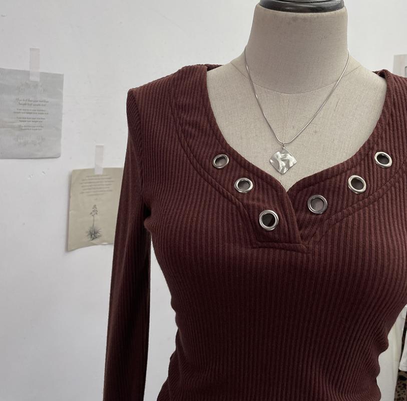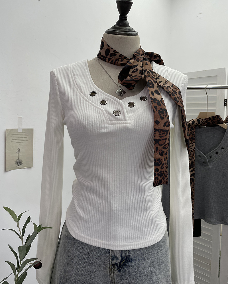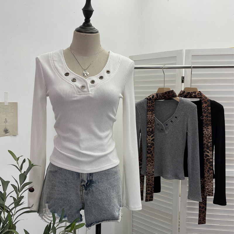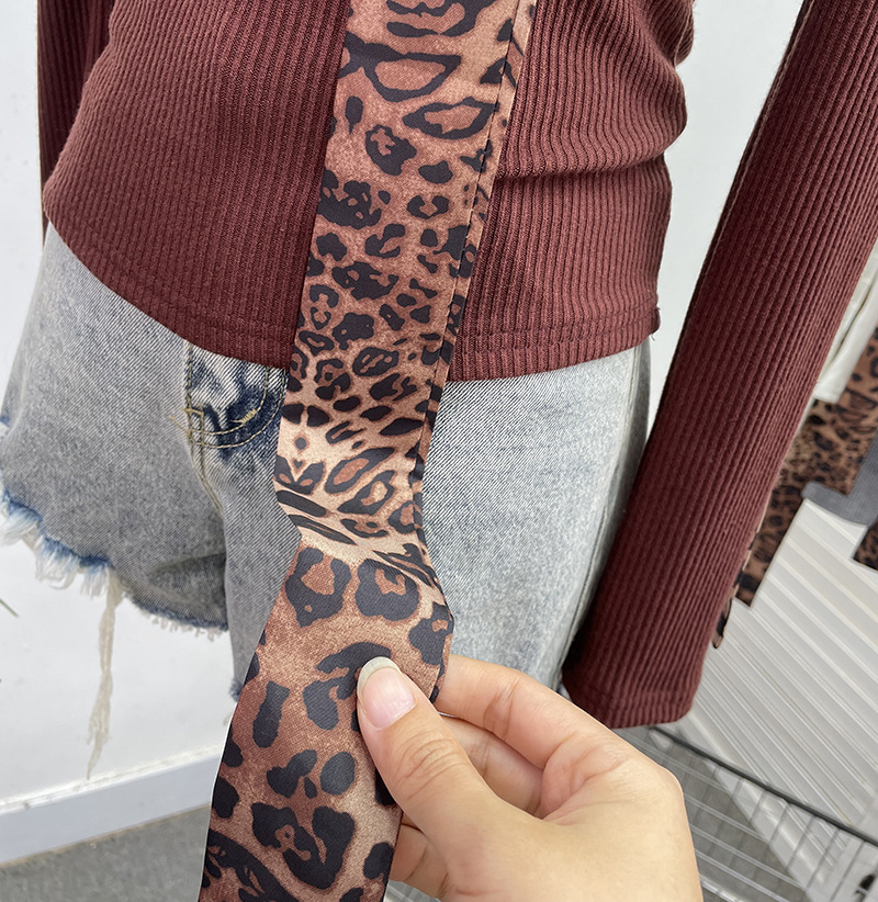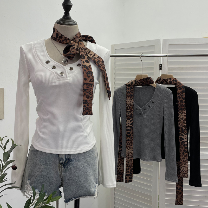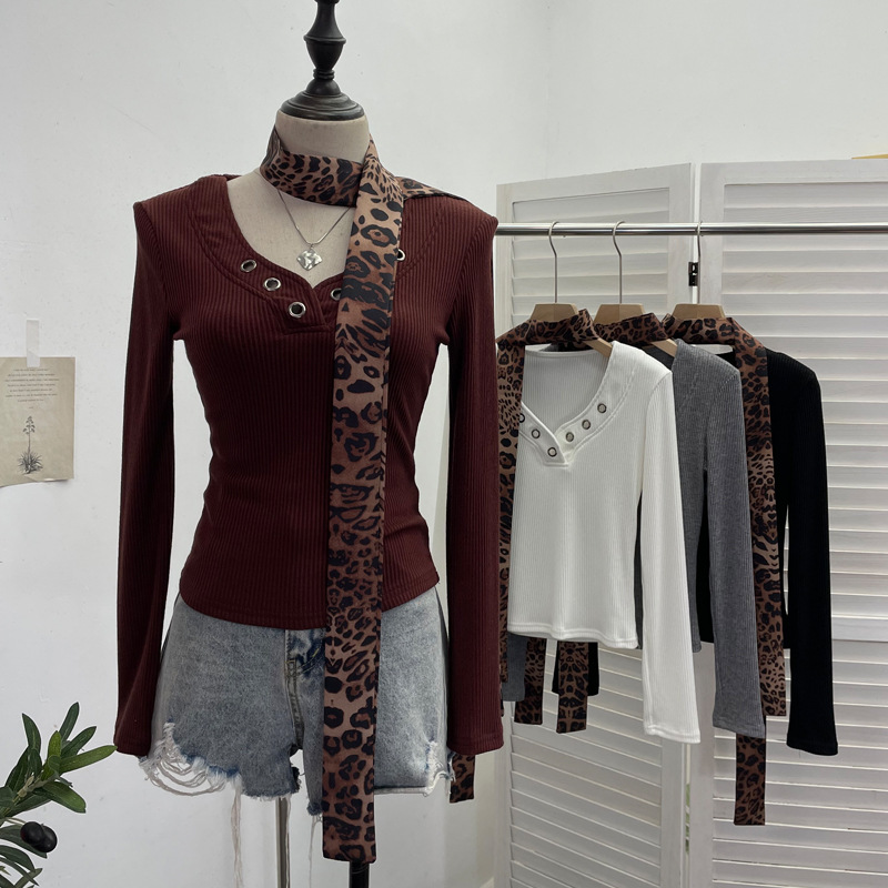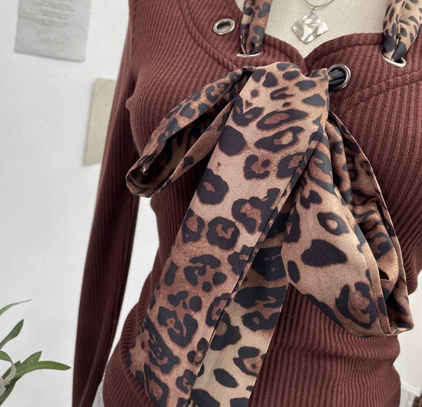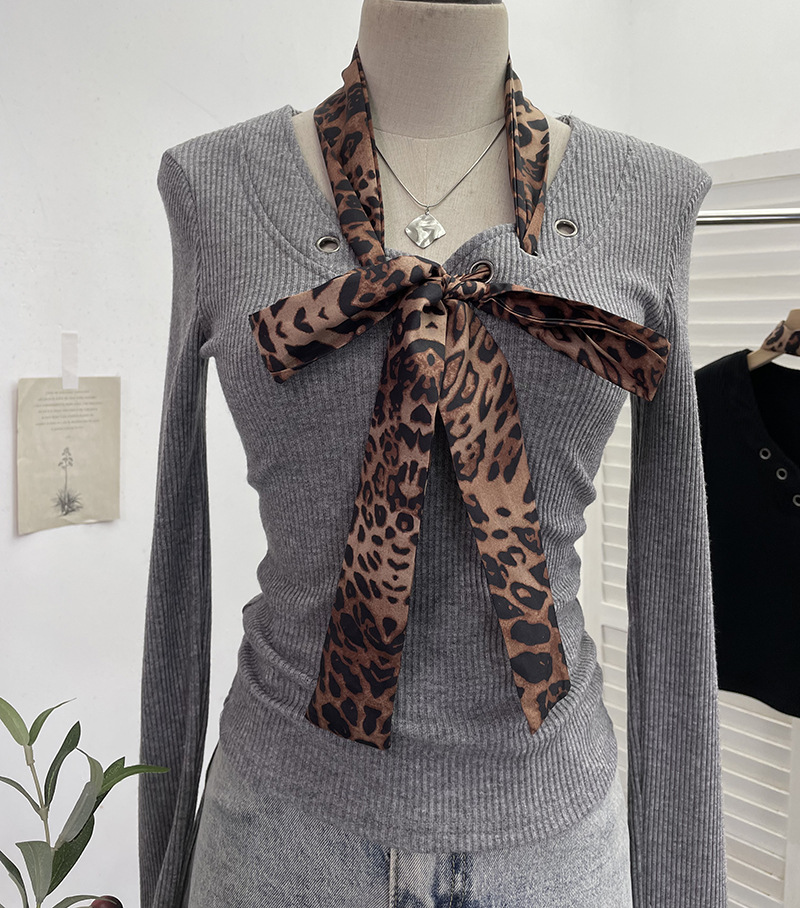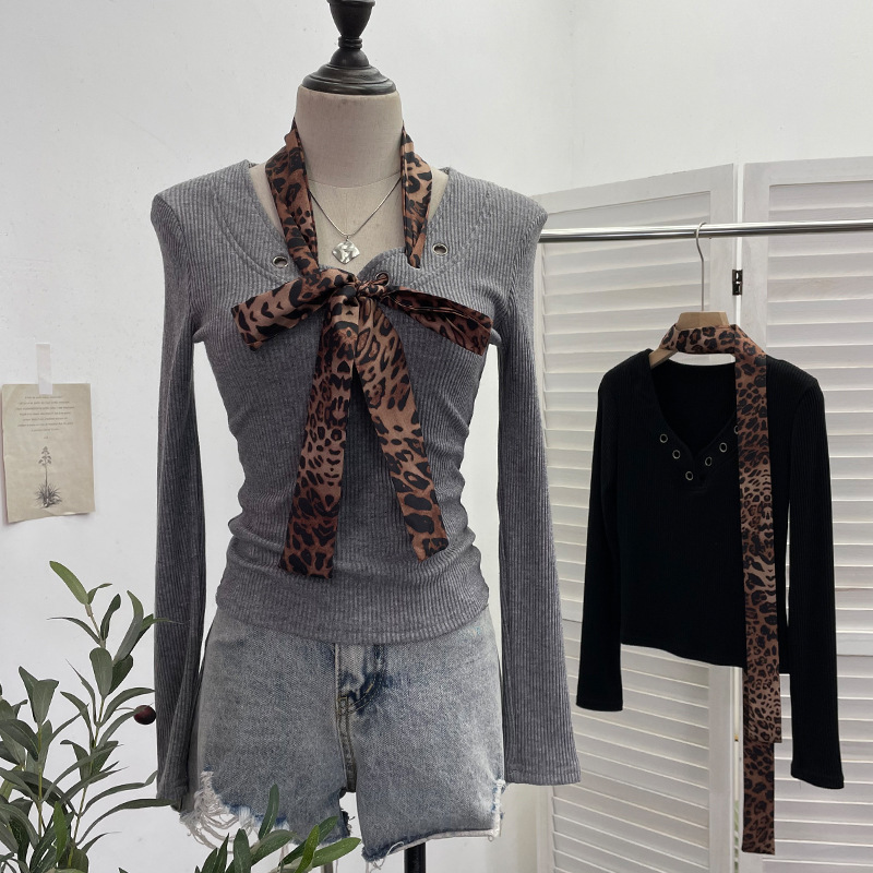 Shoulder Pad Long-sleeved Knit Top Leopard-print Scarf Lace-up Slim-fit Short Base Shirt T-shirt
