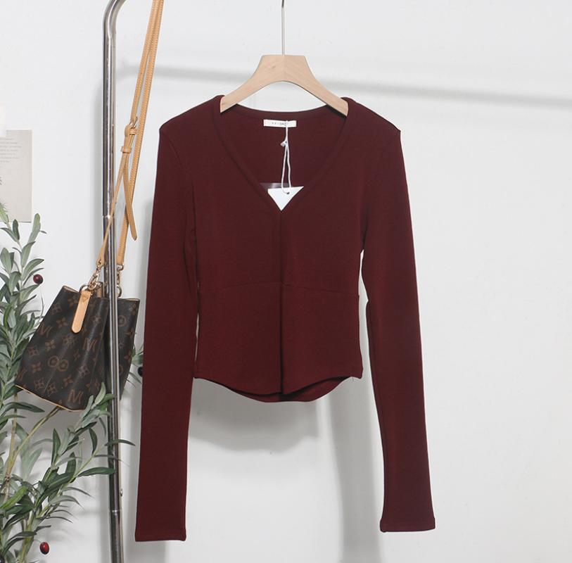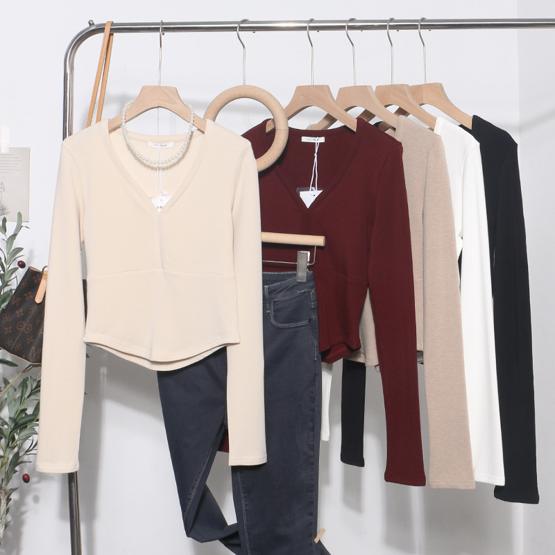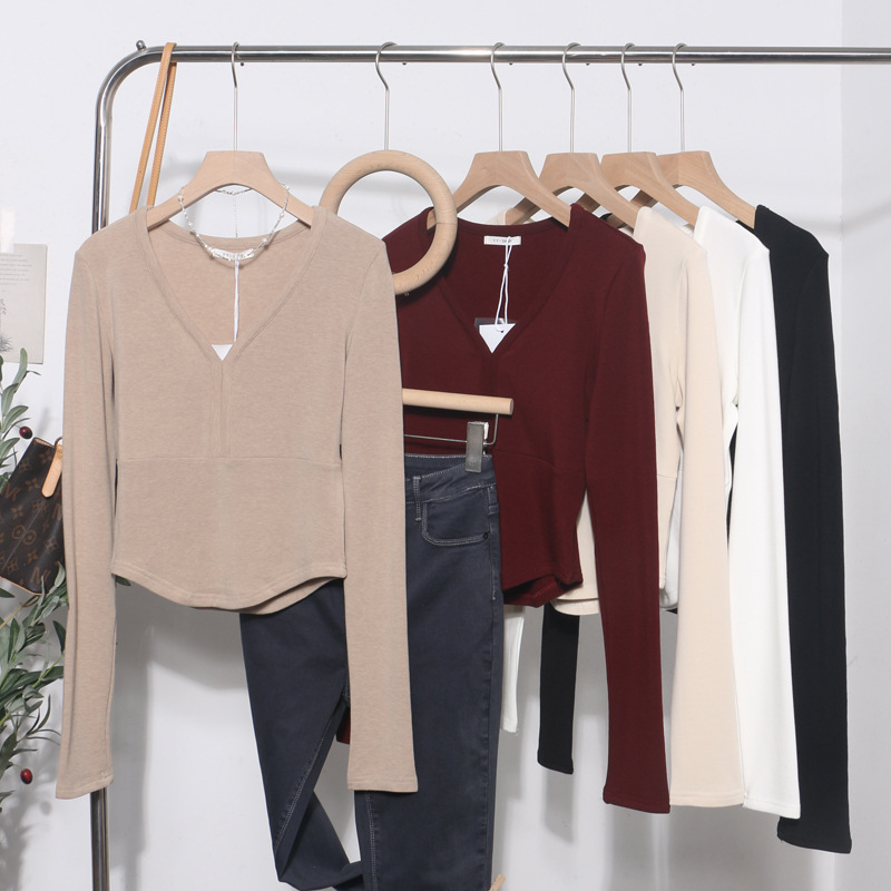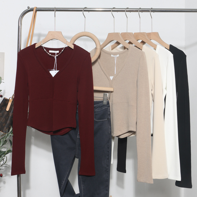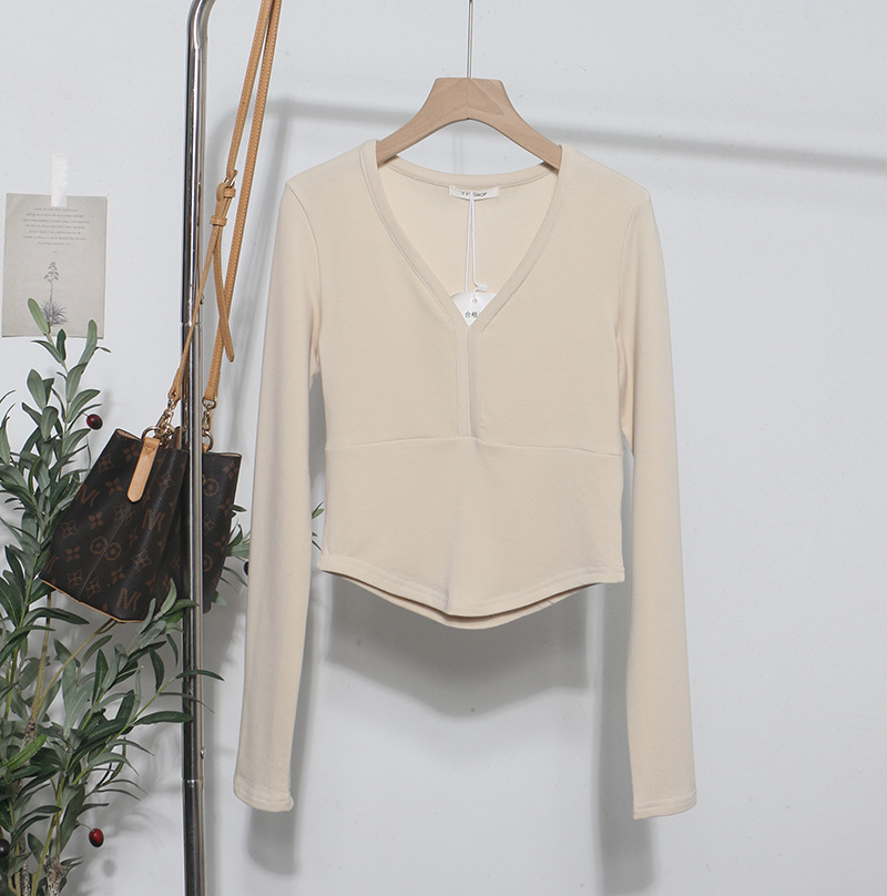 V-neck T-shirt bottoming shirt autumn and winter long sleeve slim curved short top