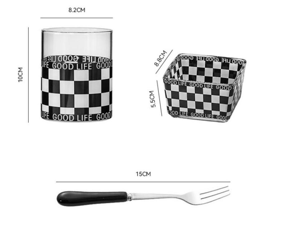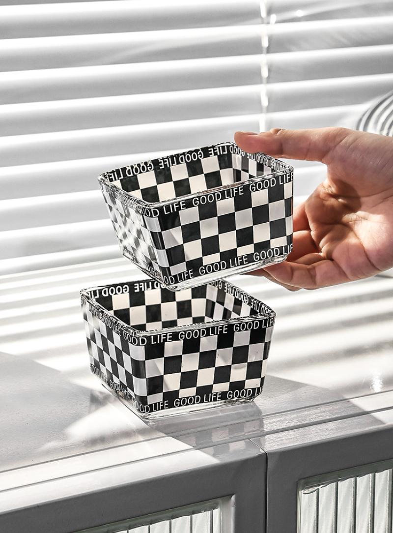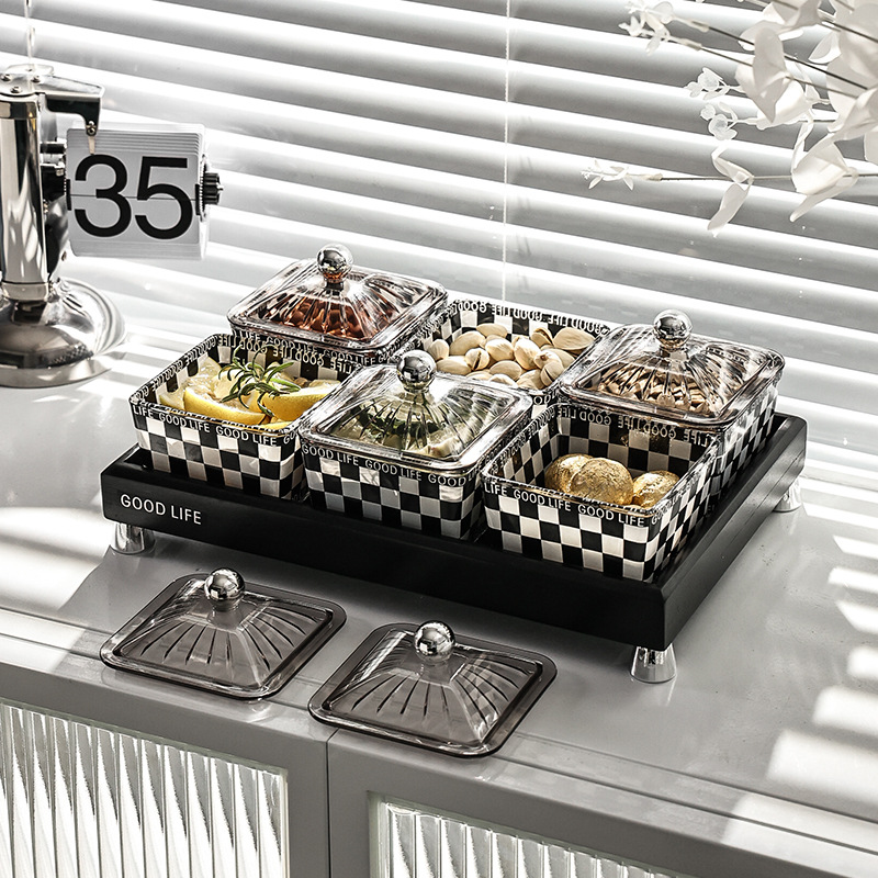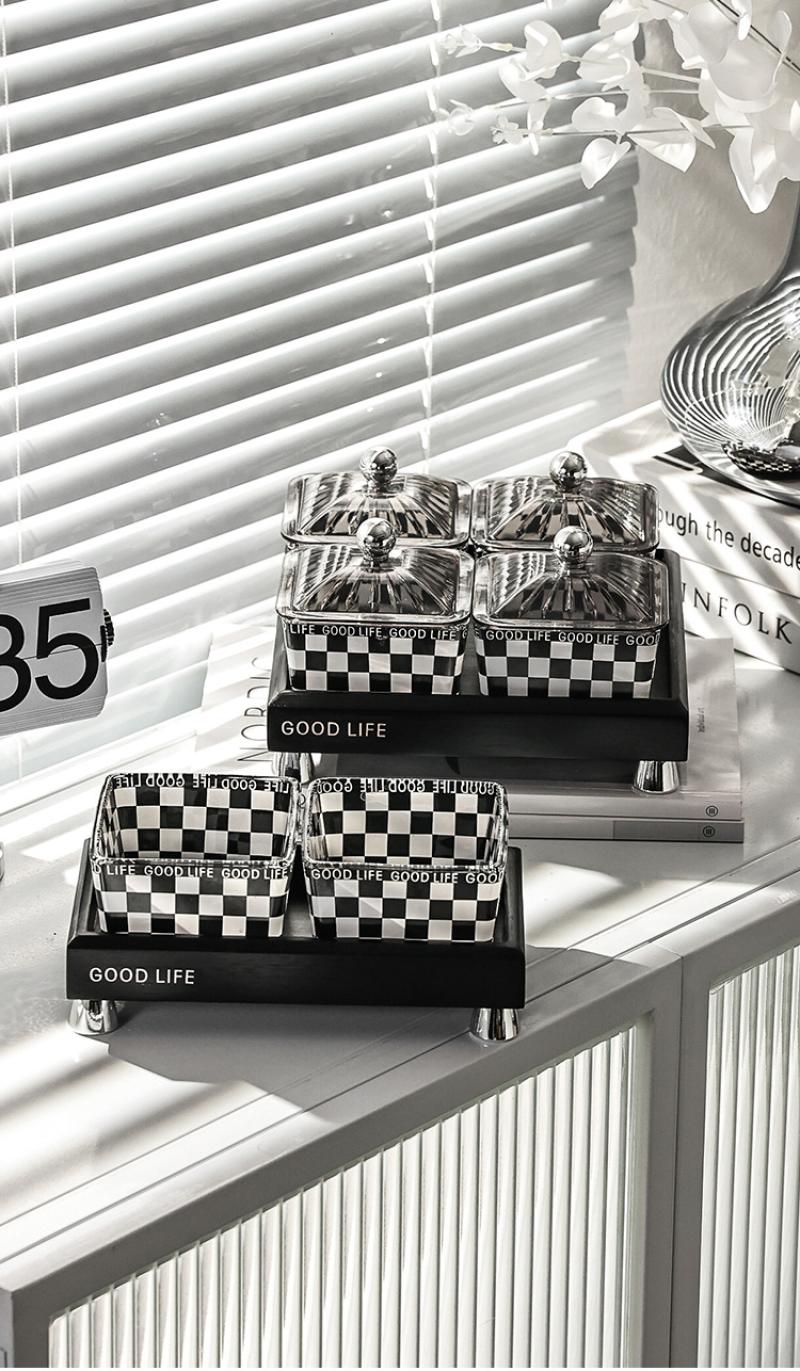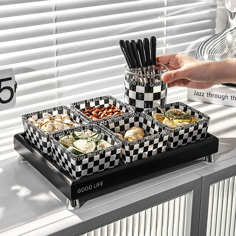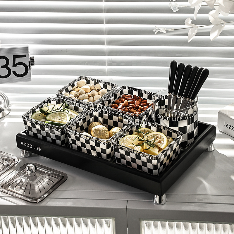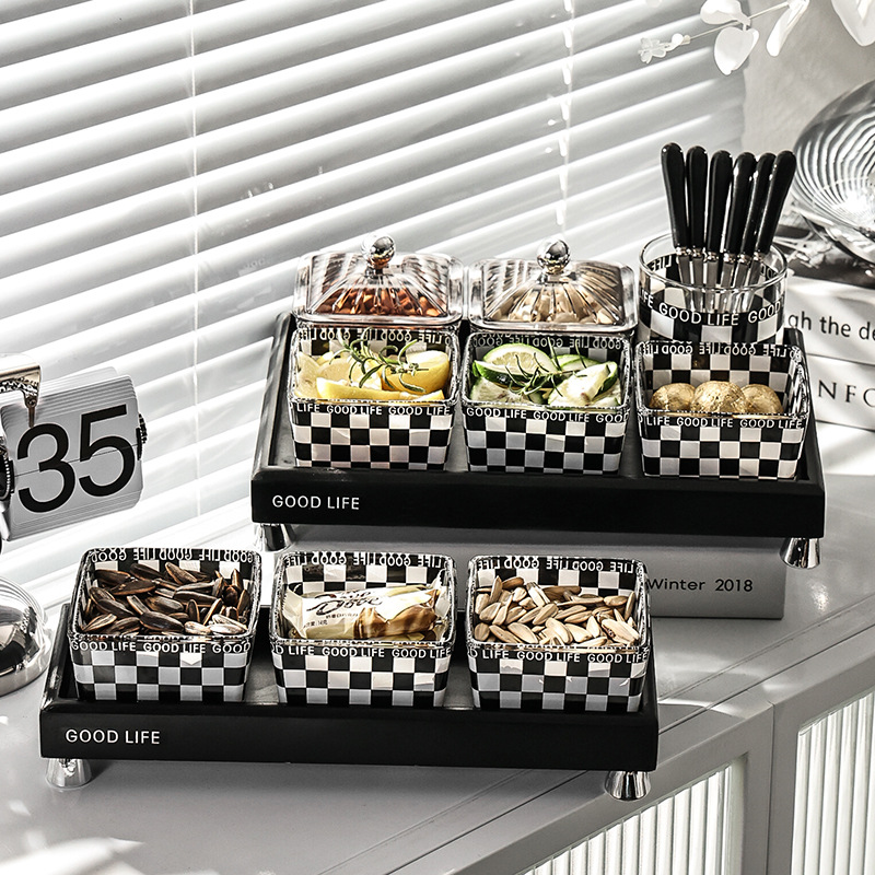 Metal & Bambú & Polipropileno-PP & Vaso Plato de fruta seca, tartán, en blanco y negro, trozo