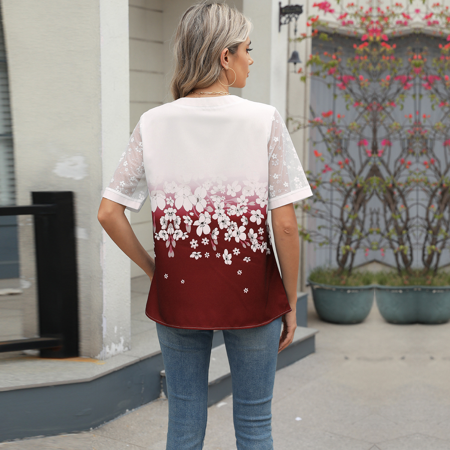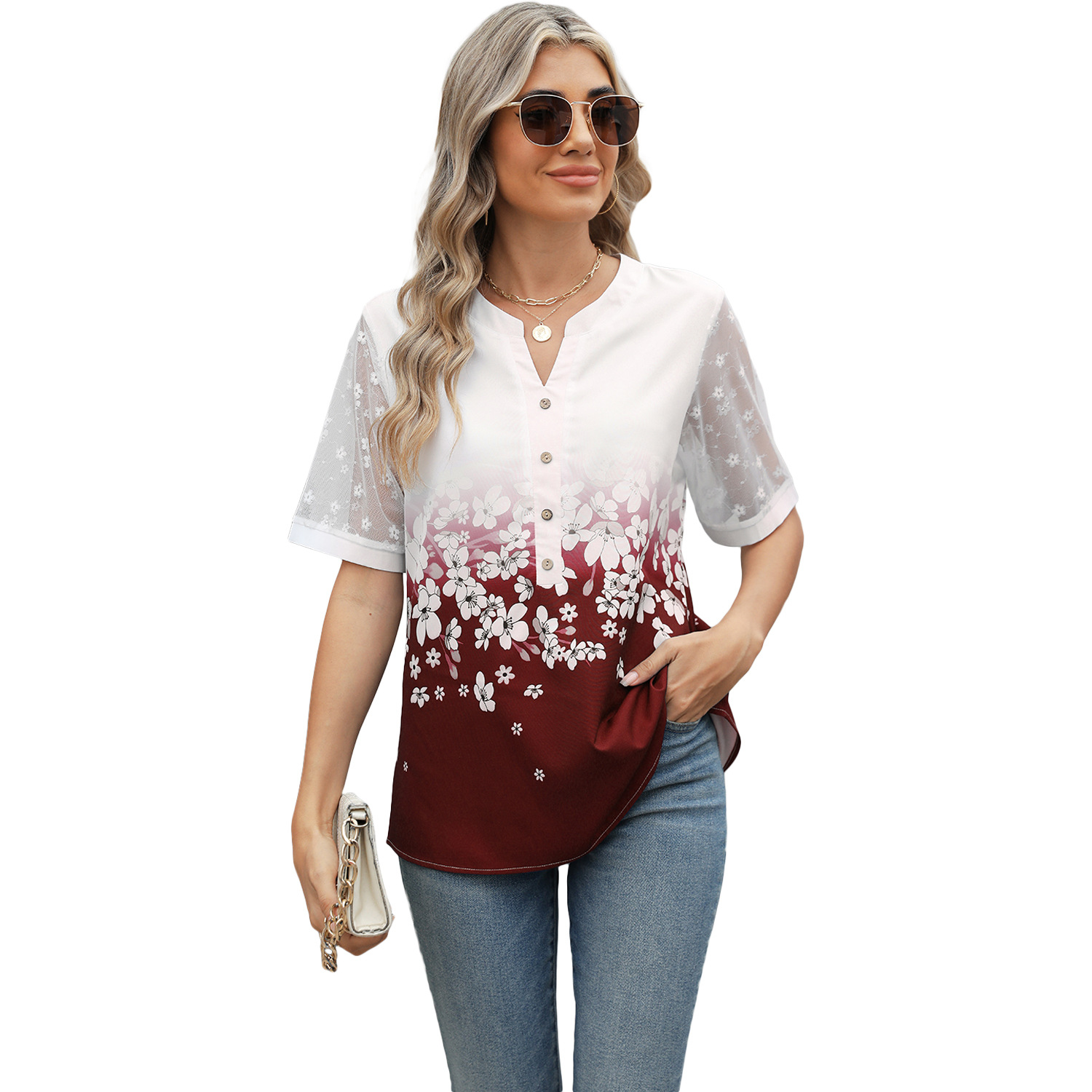New v-neck printed chiffon shirt stitching lace sleeve top for women