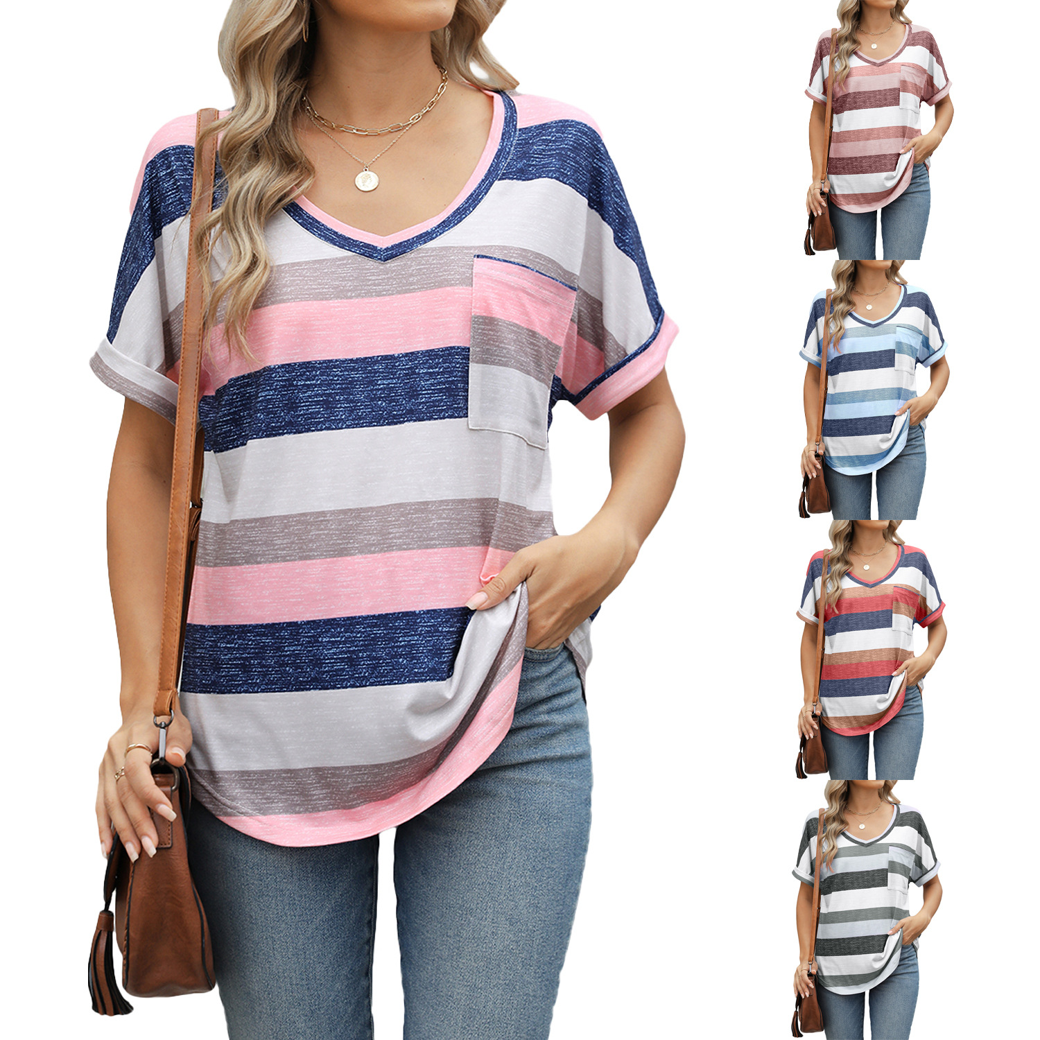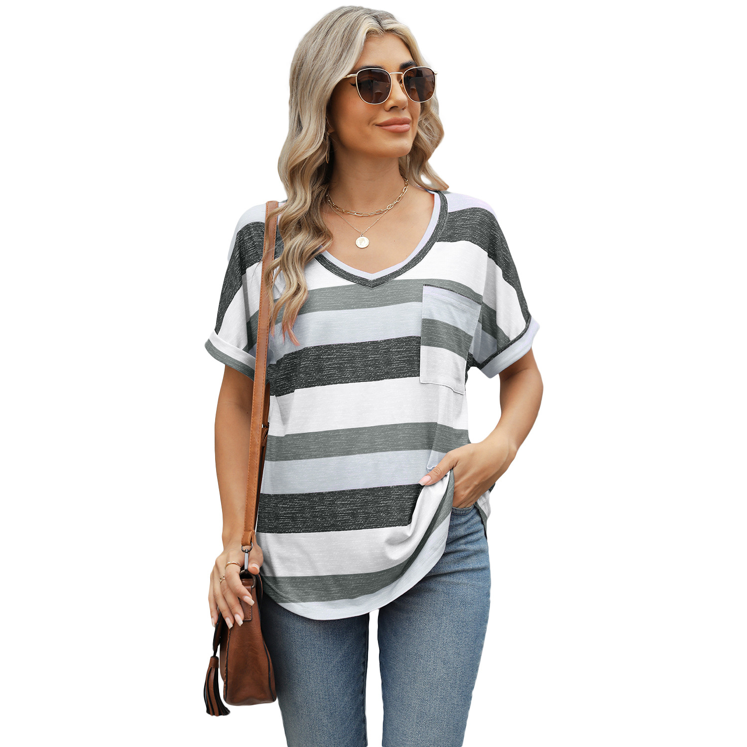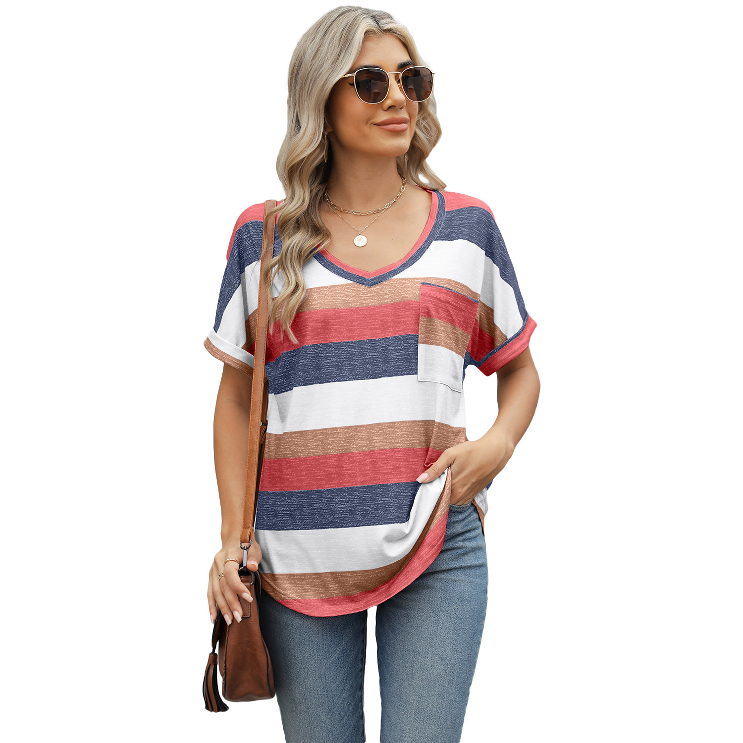 Spring and Summer New Printed Striped V-Neck Bat Sleeve Pocket T-Shirt for Women