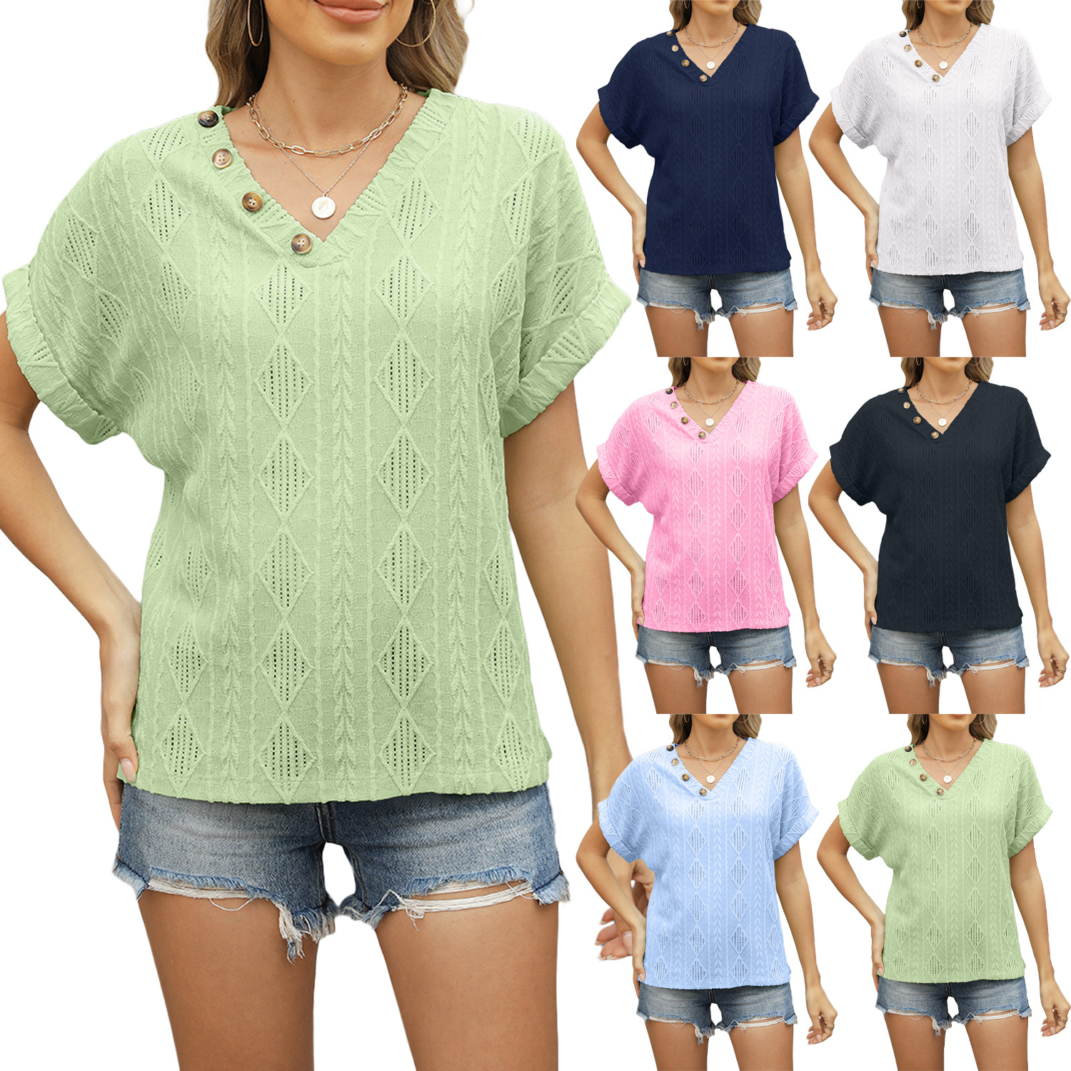 Spring and Summer New V-neck Jacquard Button Short-sleeved T-shirt Loose Hollow Top