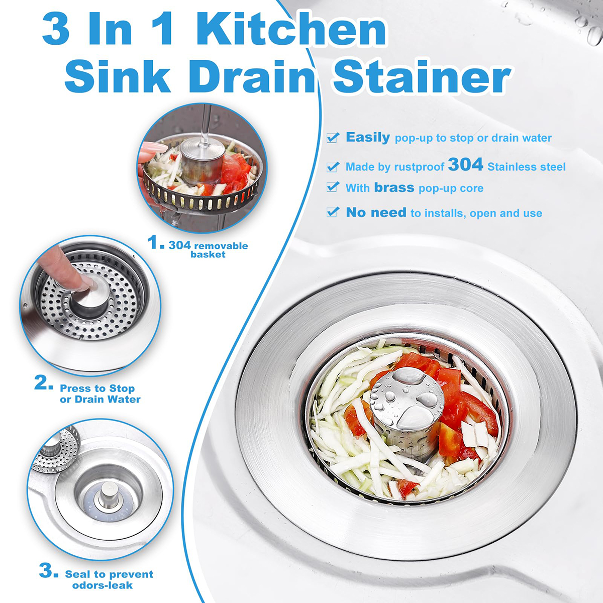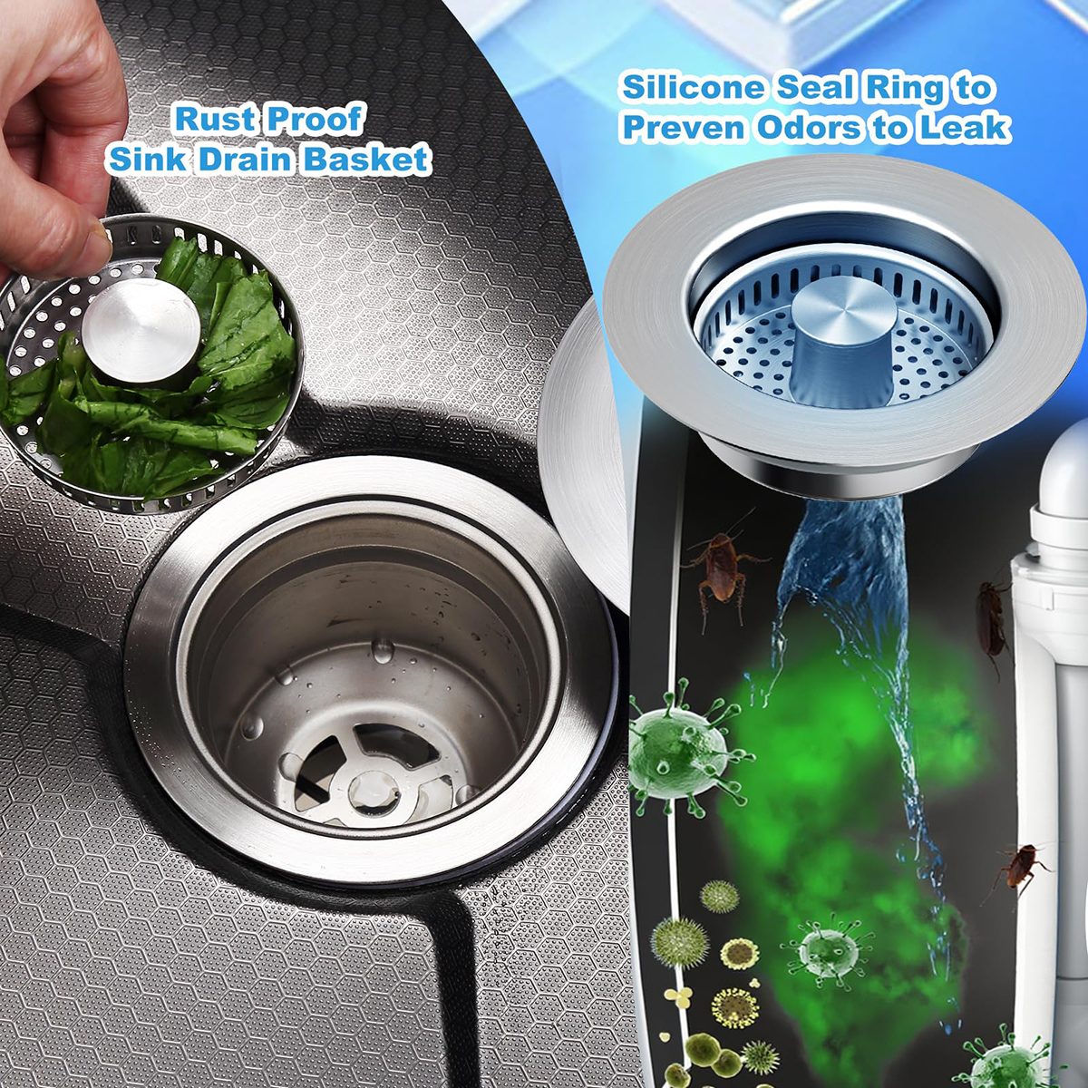 Removable Filter Basket: The inner strainer basket acts as a smart garbage disposal stopper or catcher, trapping scraps before they go down the drain hole. Simply lift the basket to discard waste—no mess, no hassle, no clogging.