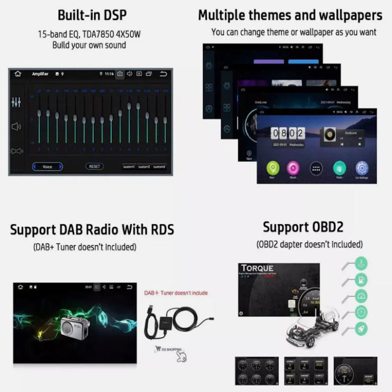 Commande au volant, entrée USB, écran tactile, DSP, OBD2