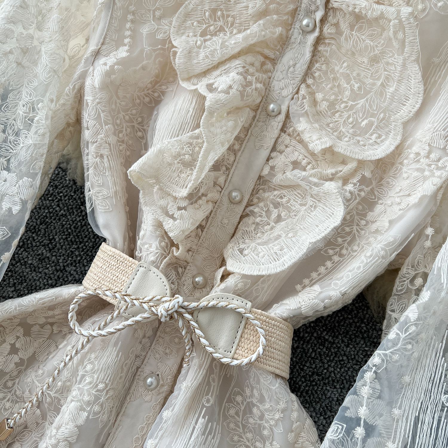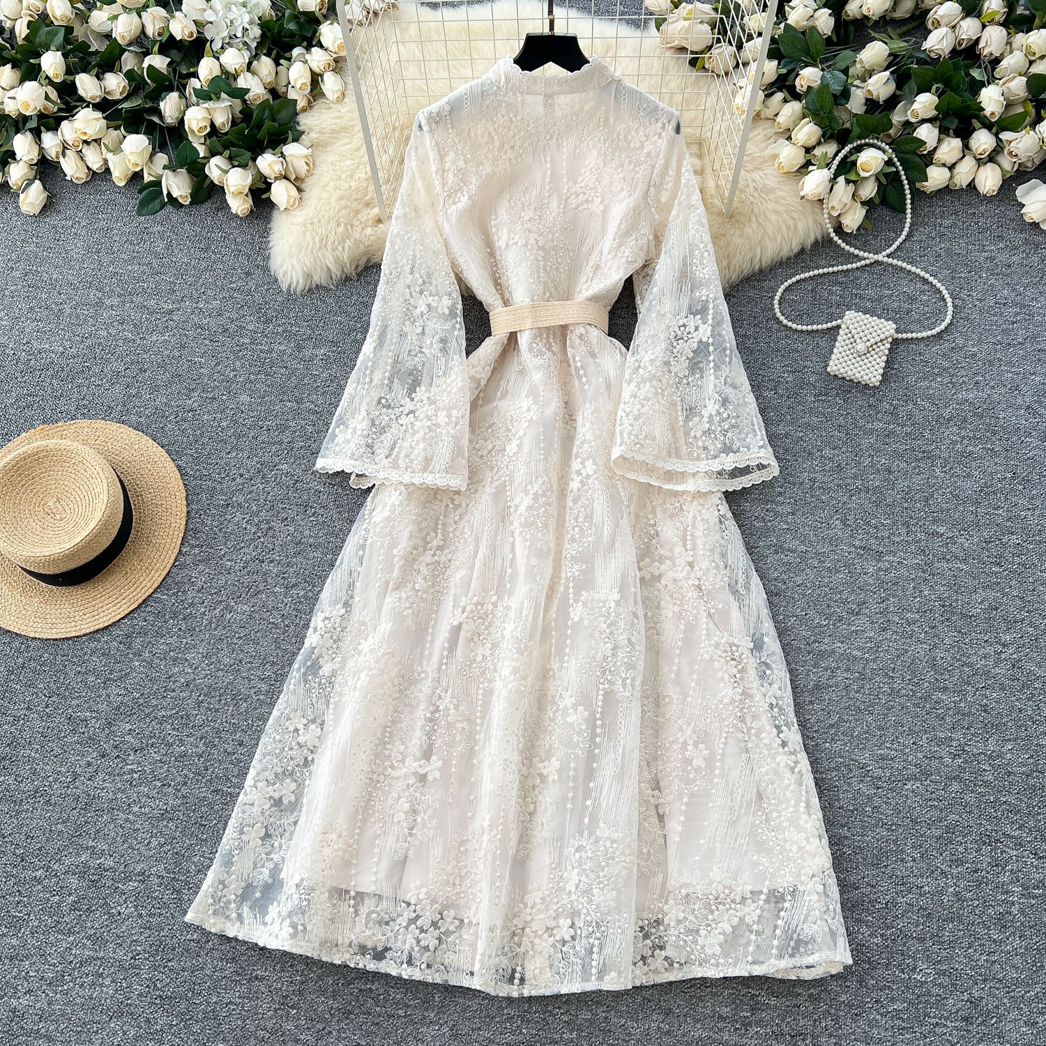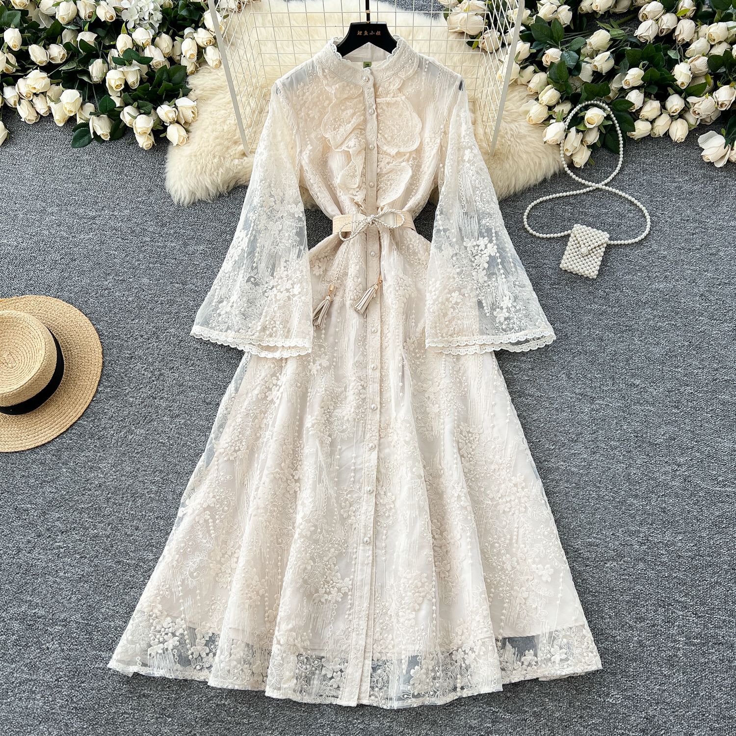 French Elegant Crochet Embroidery Stand Collar Stitching Horn Sleeve Long dress