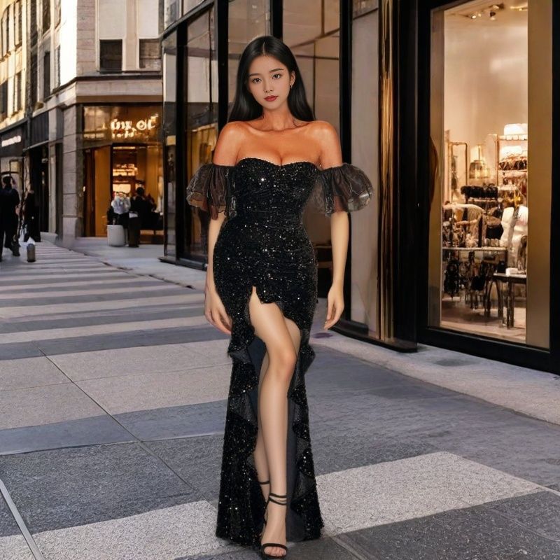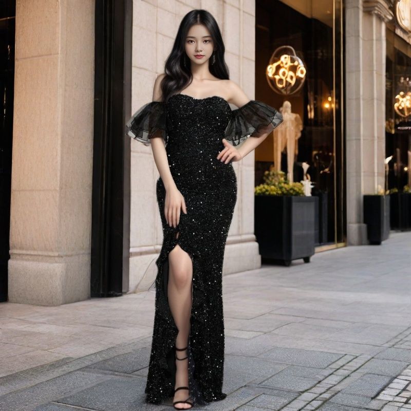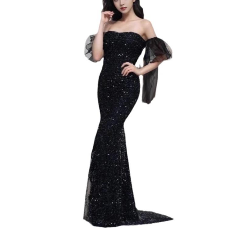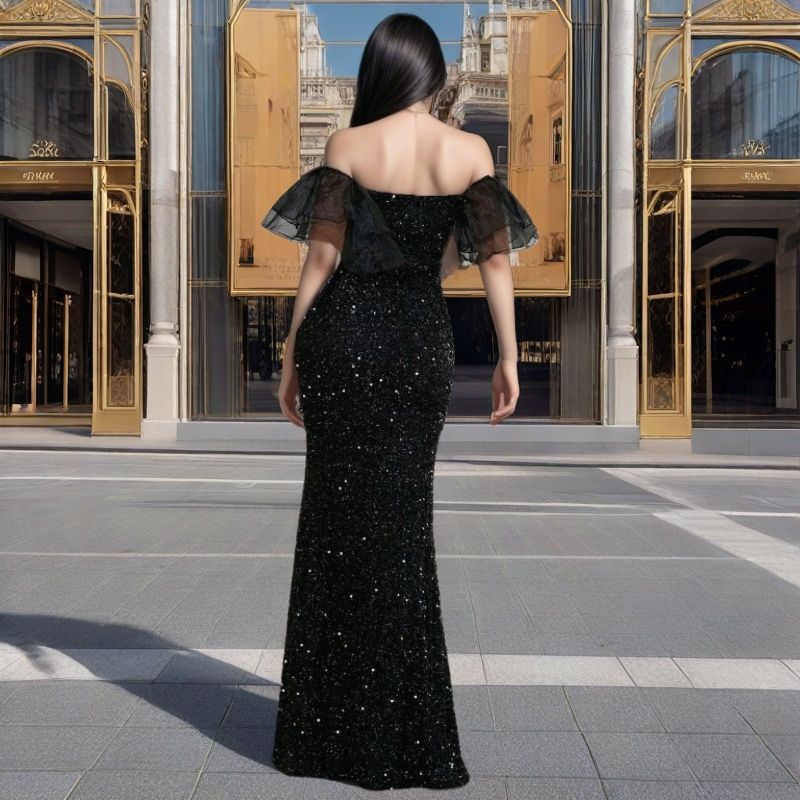 Organza & Polyester Robe longue de soirée Paillettes Noir pièce