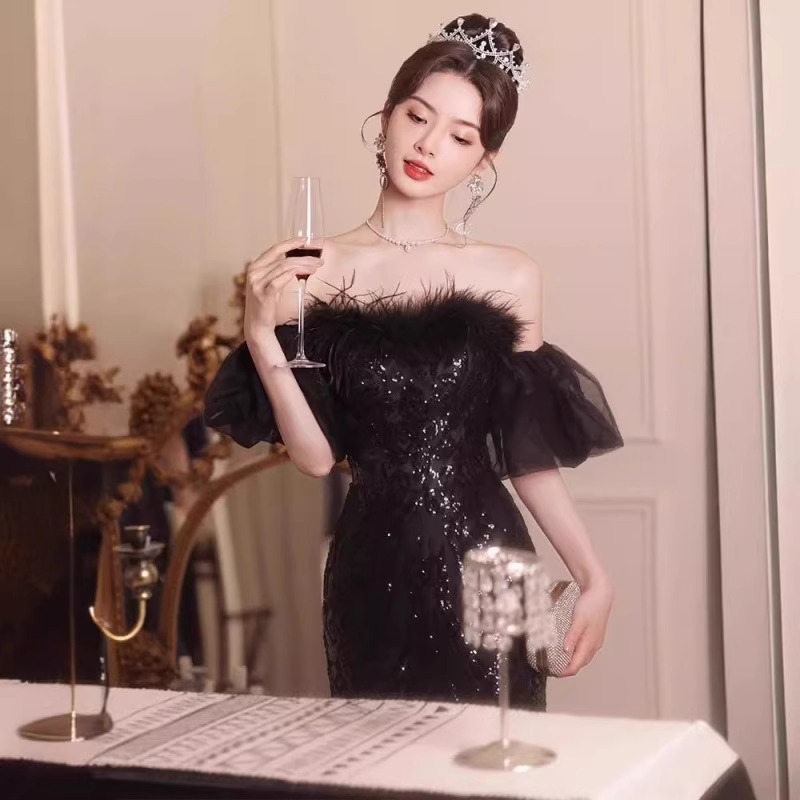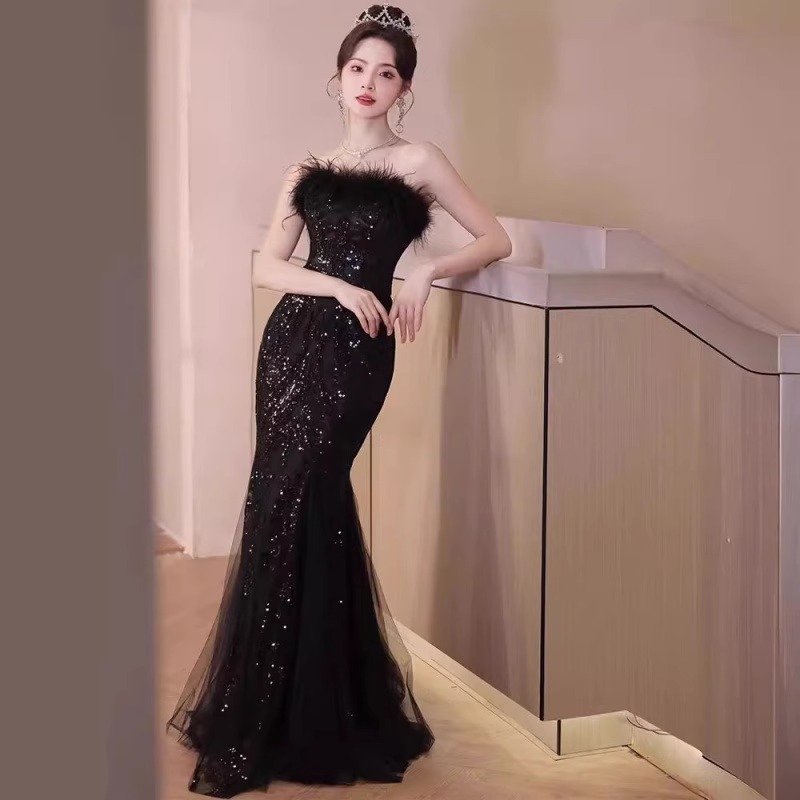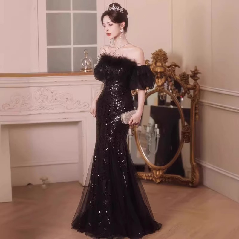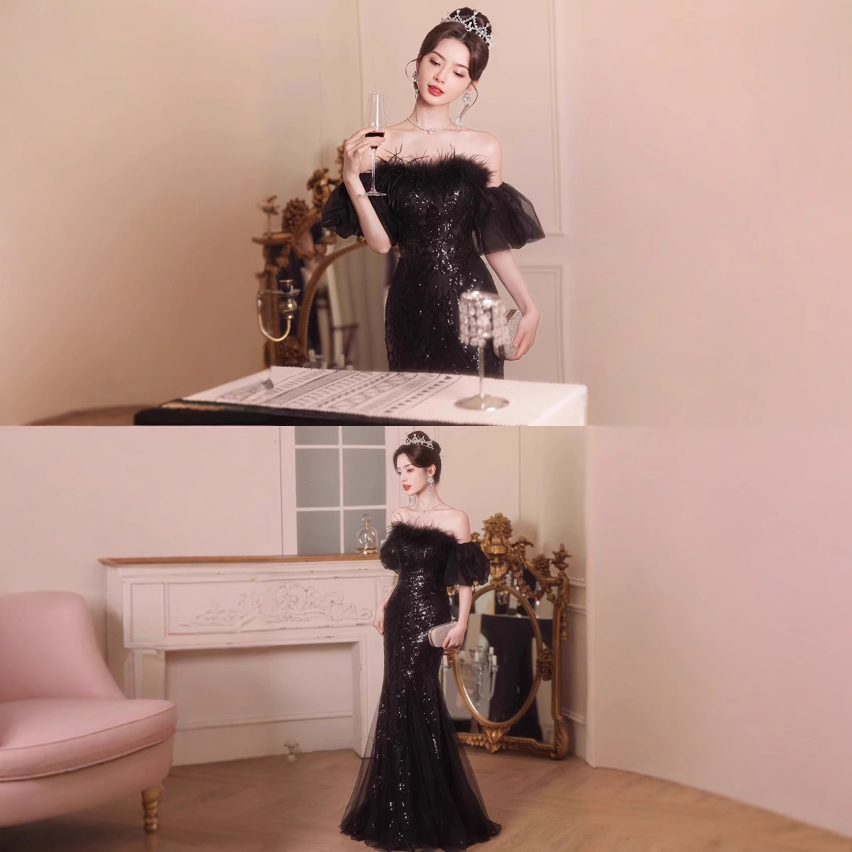 Polyester Robe longue de soirée Paillettes Patchwork Solide Noir pièce