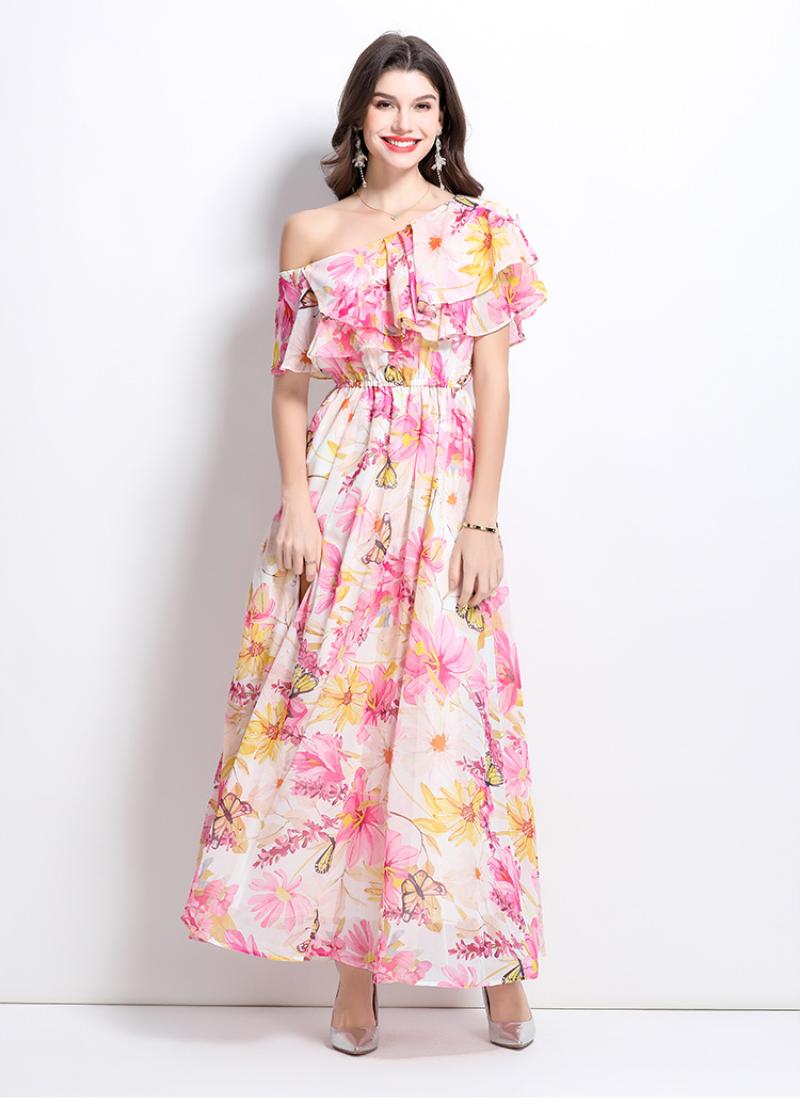Robe en mousseline de soie imprimée de style vacances pour femmes nouvelle robe moulante à taille volantée