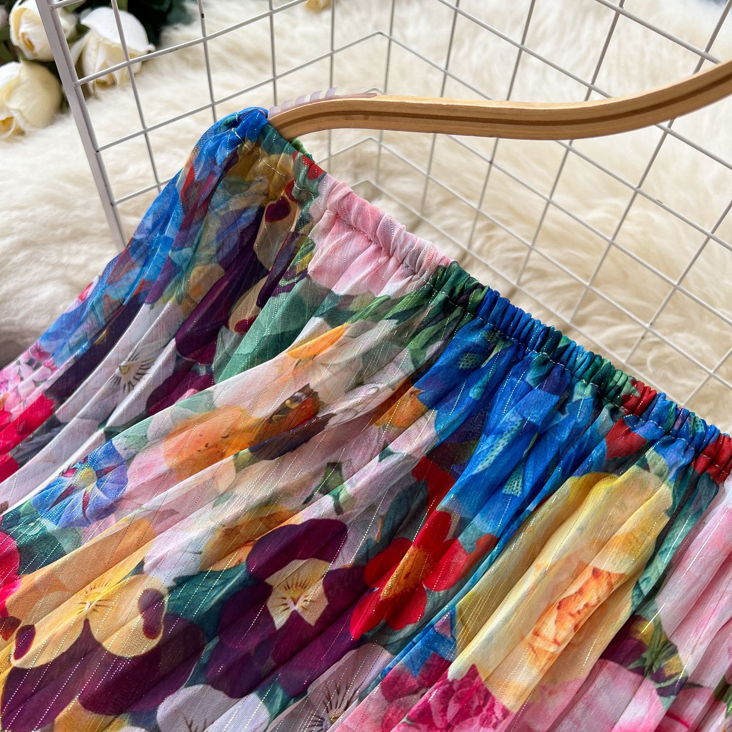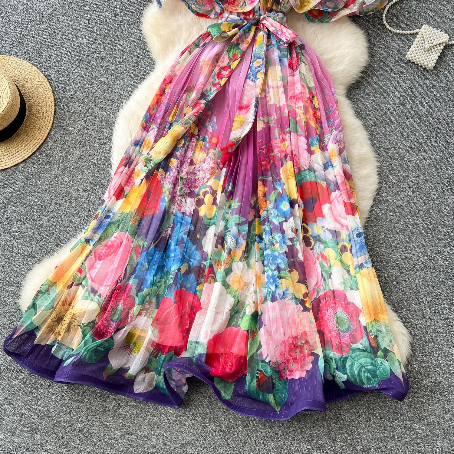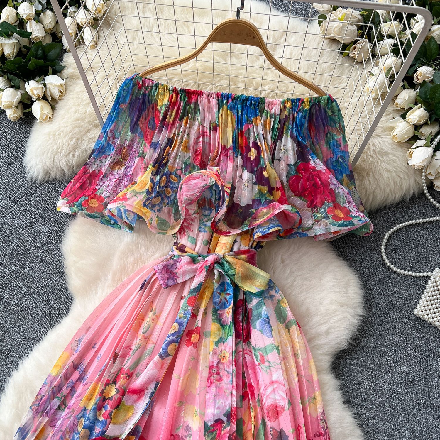 Vacation Style off-shoulder Ruffled Printed dress Women's Spring Chiffon Long Dress