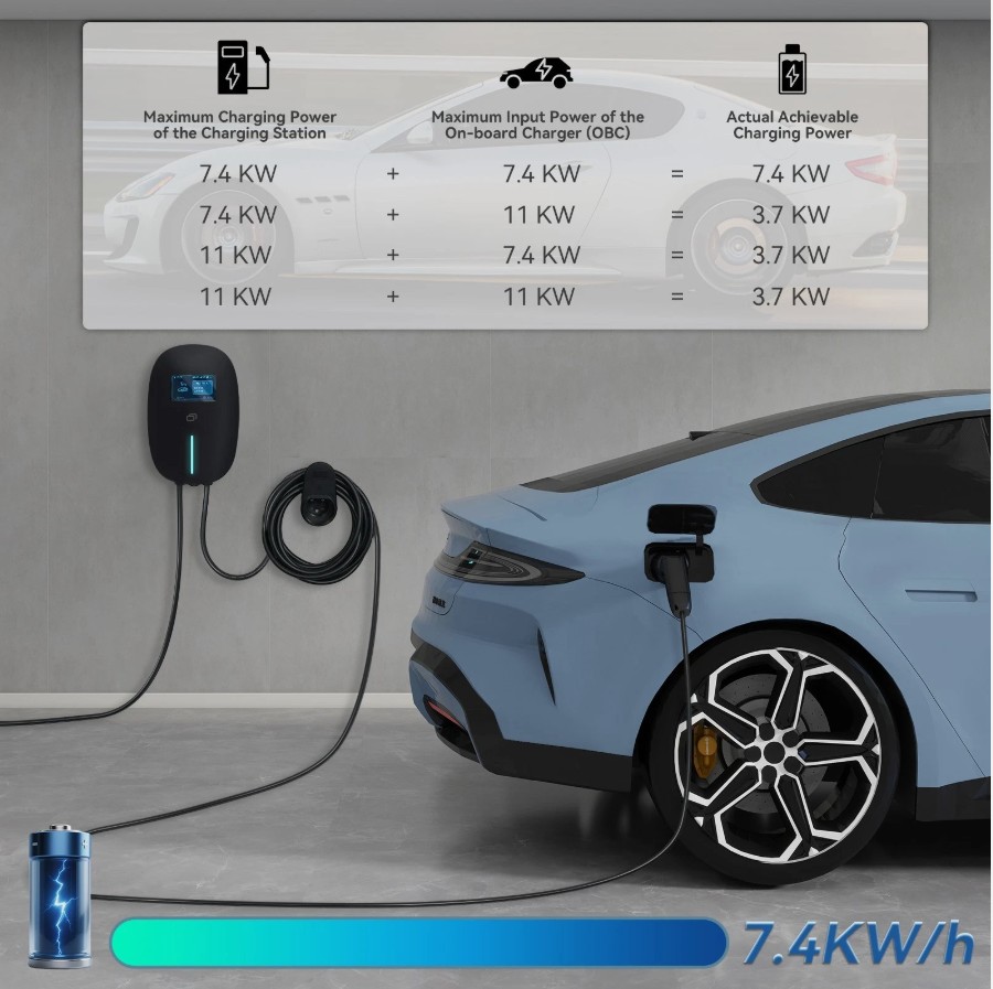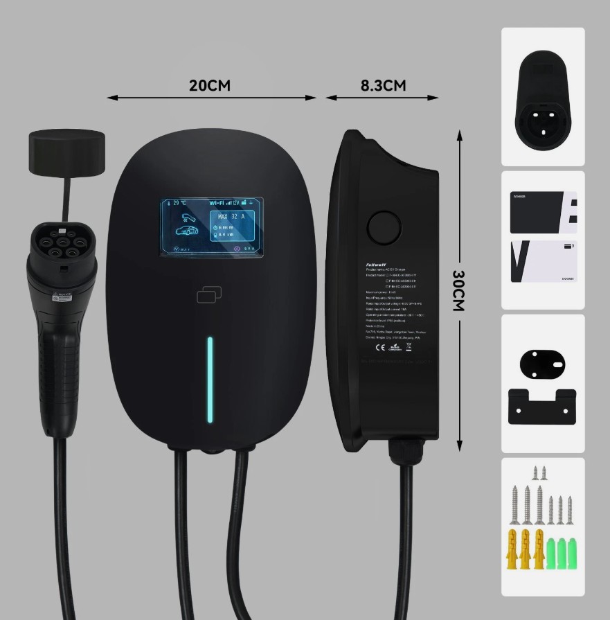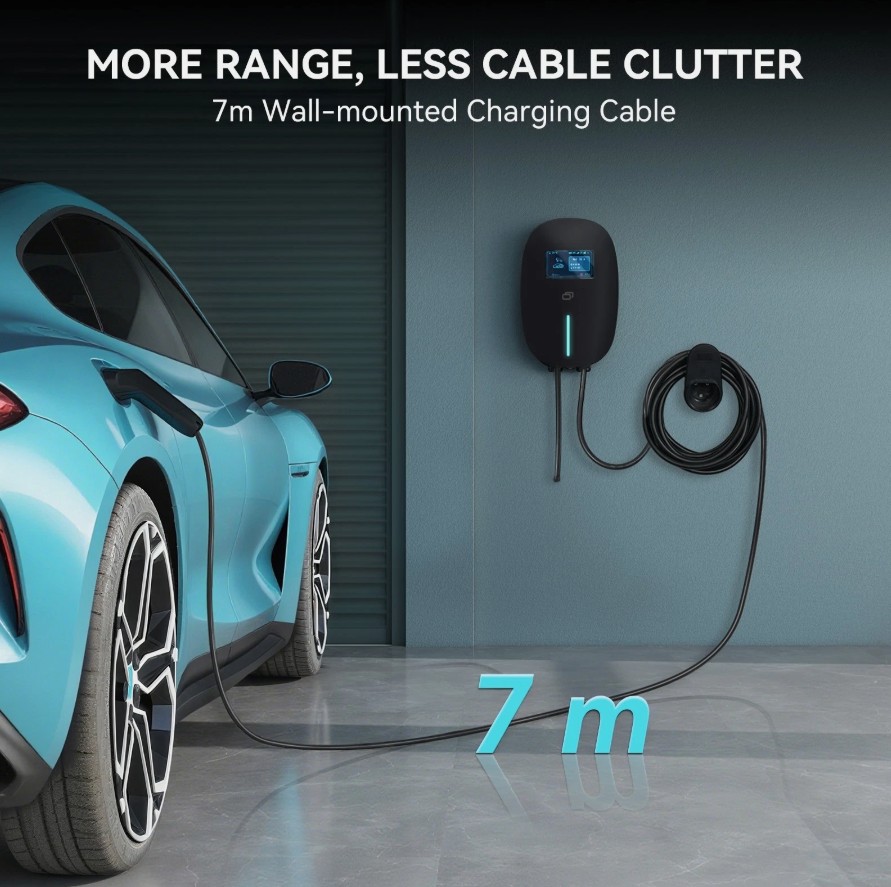 7kW EV充電器 32A スマートEV充電ステーション 7m充電ケーブル付き タイプ2 ブラック