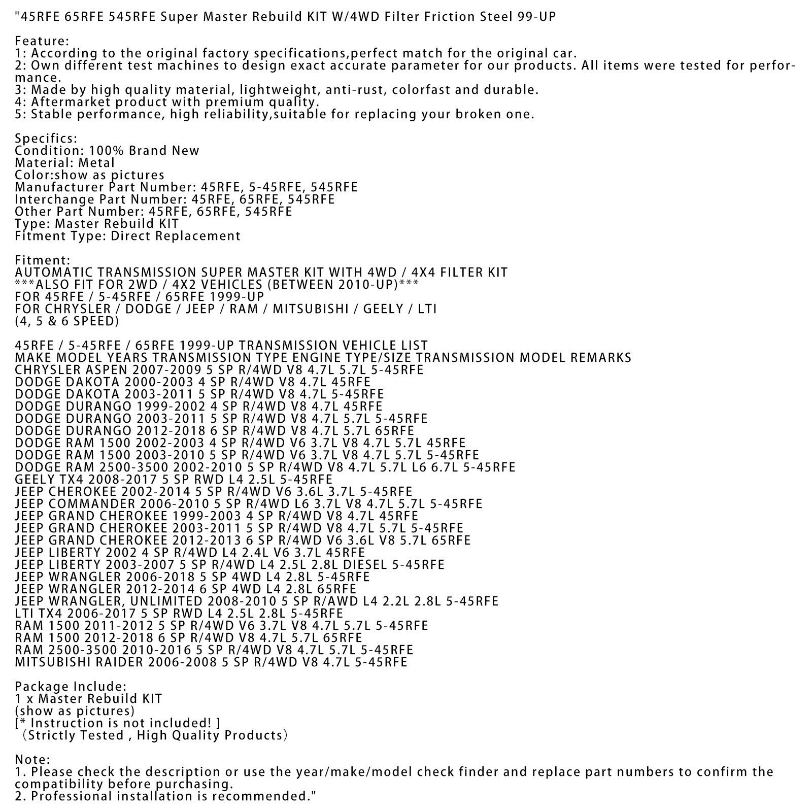 45RFE 65RFE 545RFE Super Master Revisieset met 4WD-filter wrijvingsstaal VS