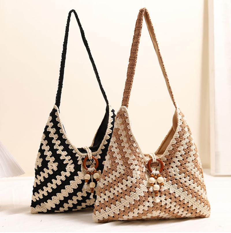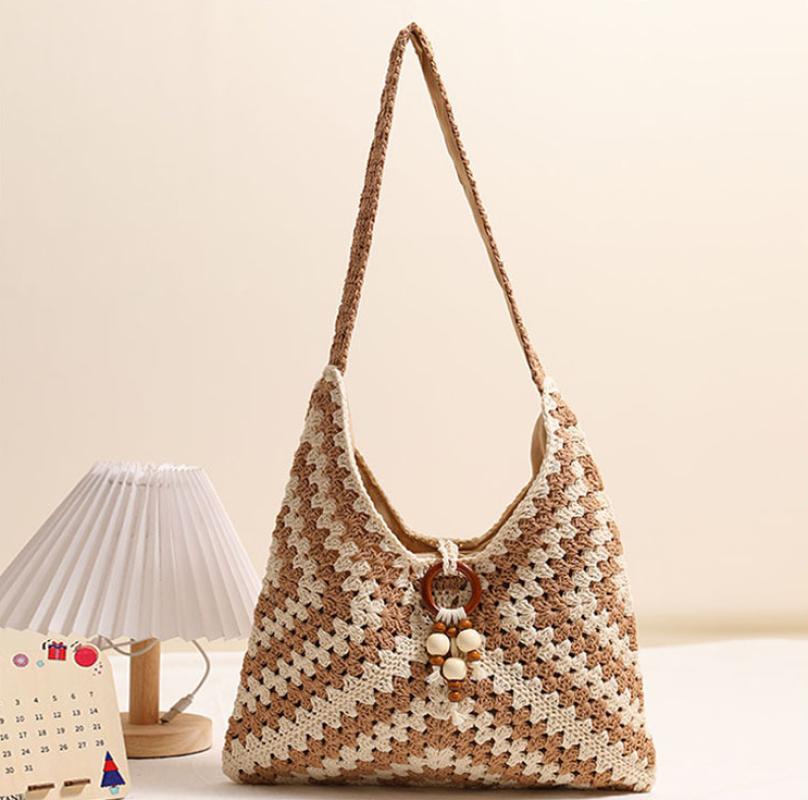Ethnic Style Shoulder Cotton Woven Bag New Lattice Straw Woven Bag Beach Bag