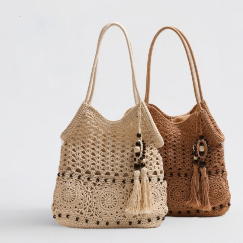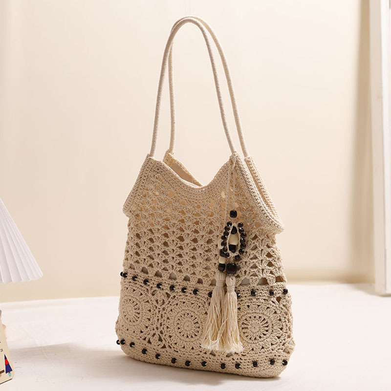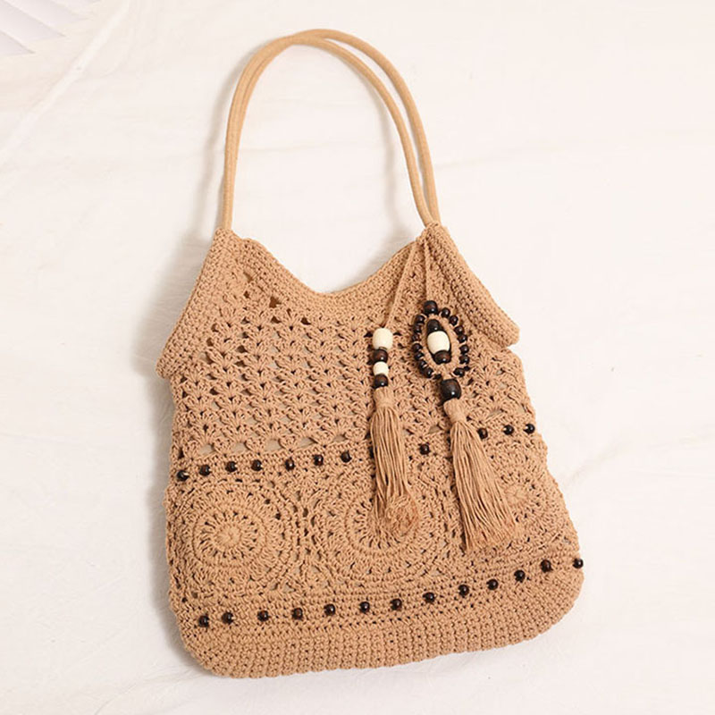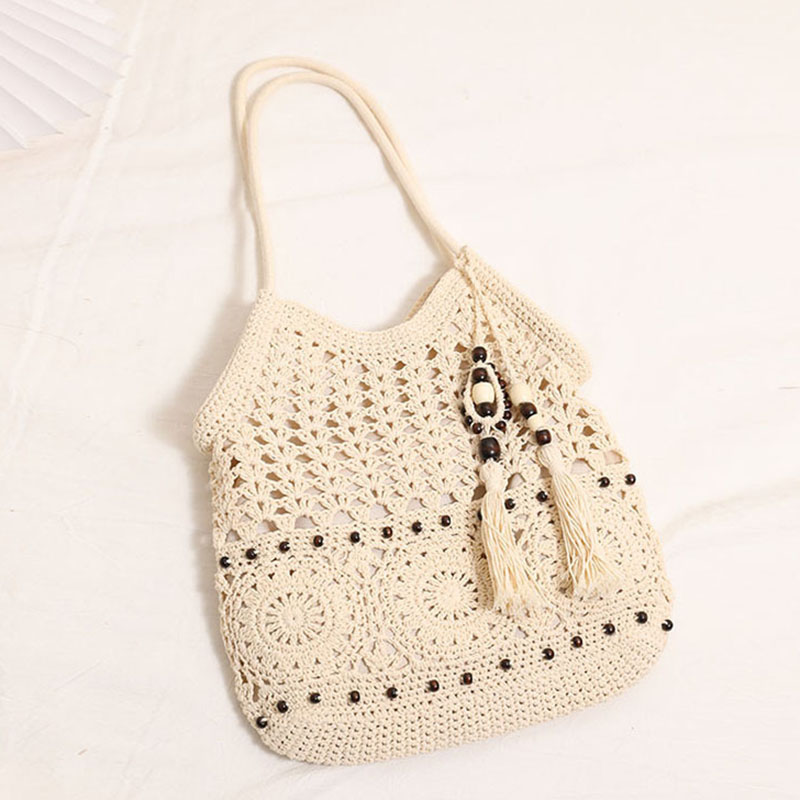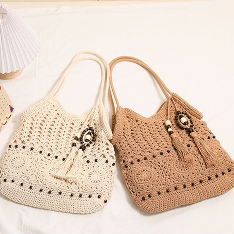 Fashion Wooden Beads Tassel Shoulder Cotton Woven Bag New Hollow Straw Woven Bag