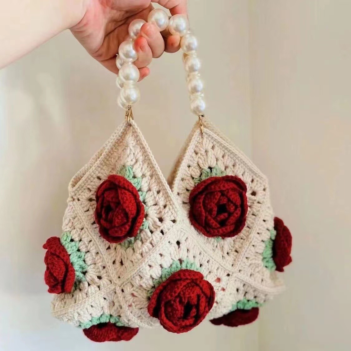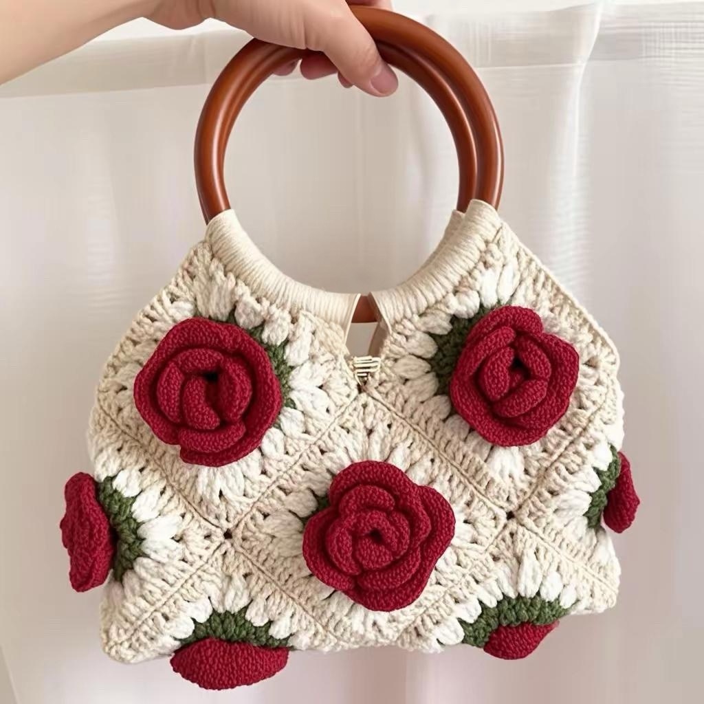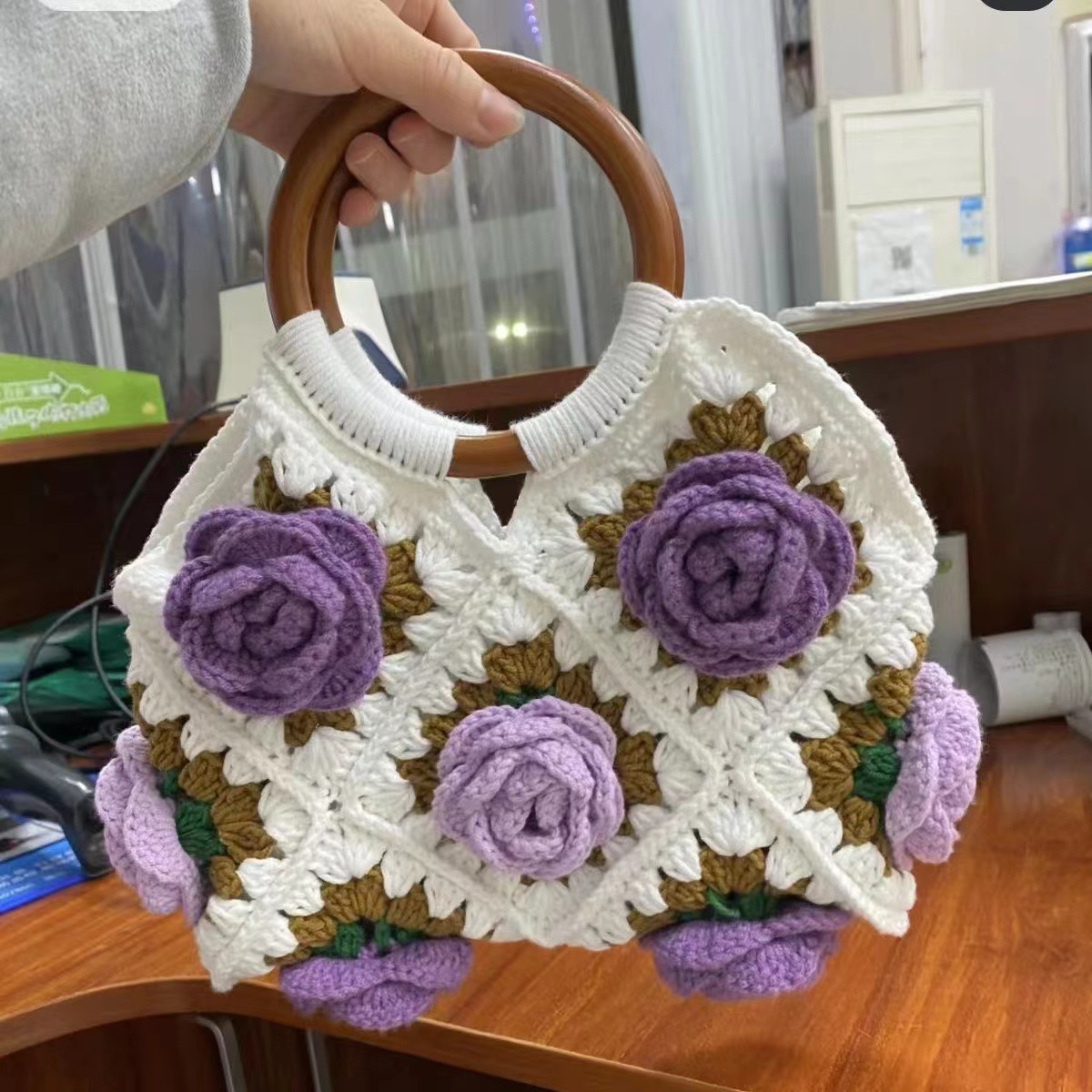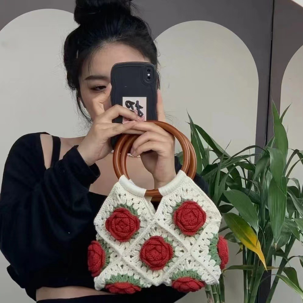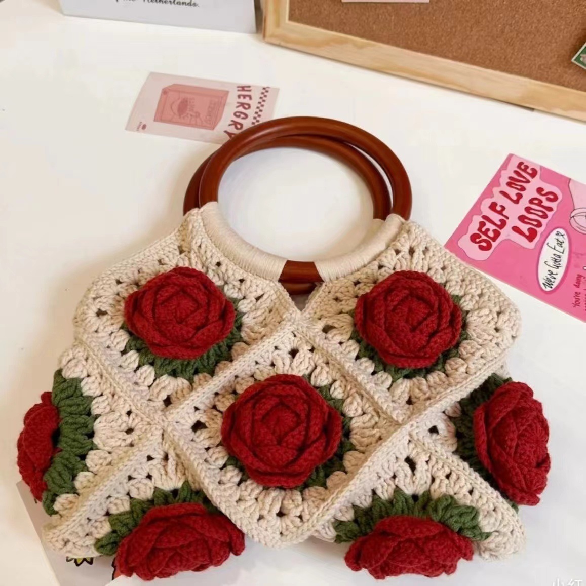 Vintage rose DIY Kit NOT FINISHED BAG portable woven material handmade wool crochet all-match