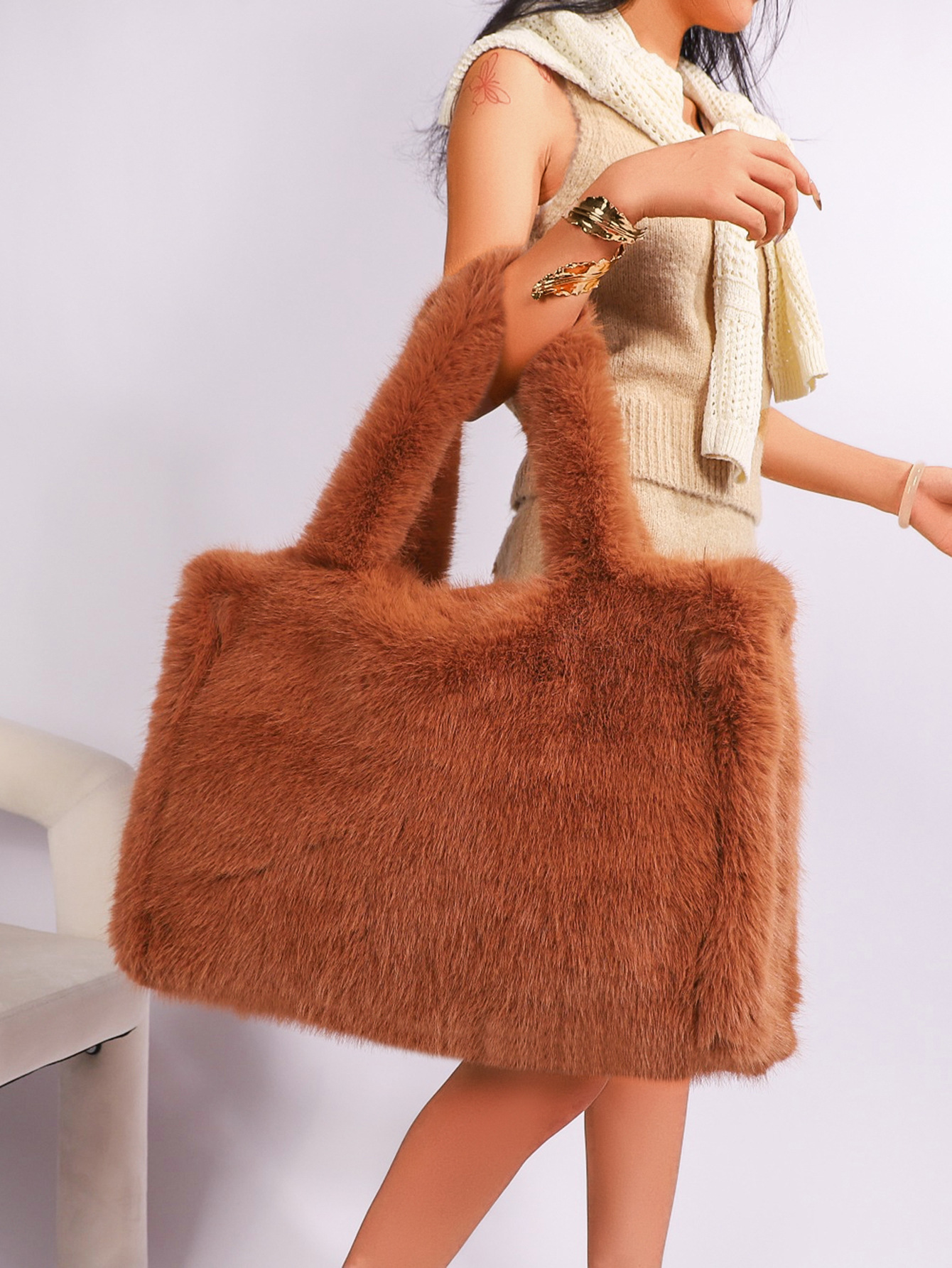 Artificial Wool Handbag large capacity & soft surface & attached with hanging strap Solid PC