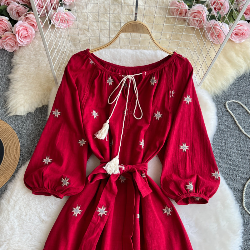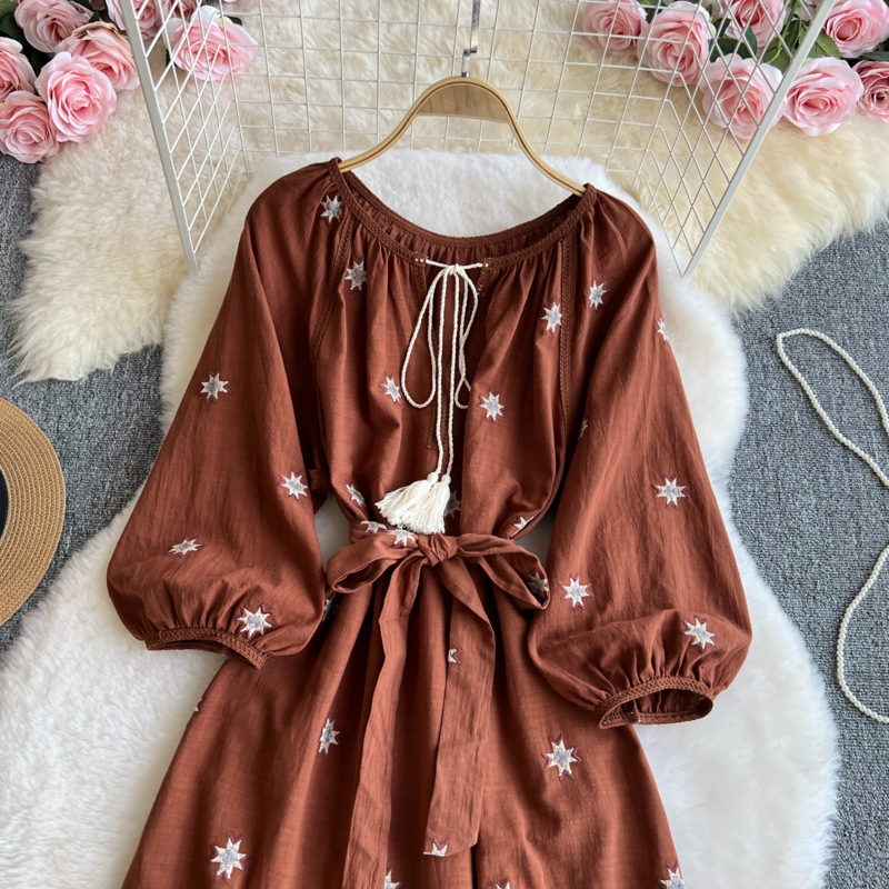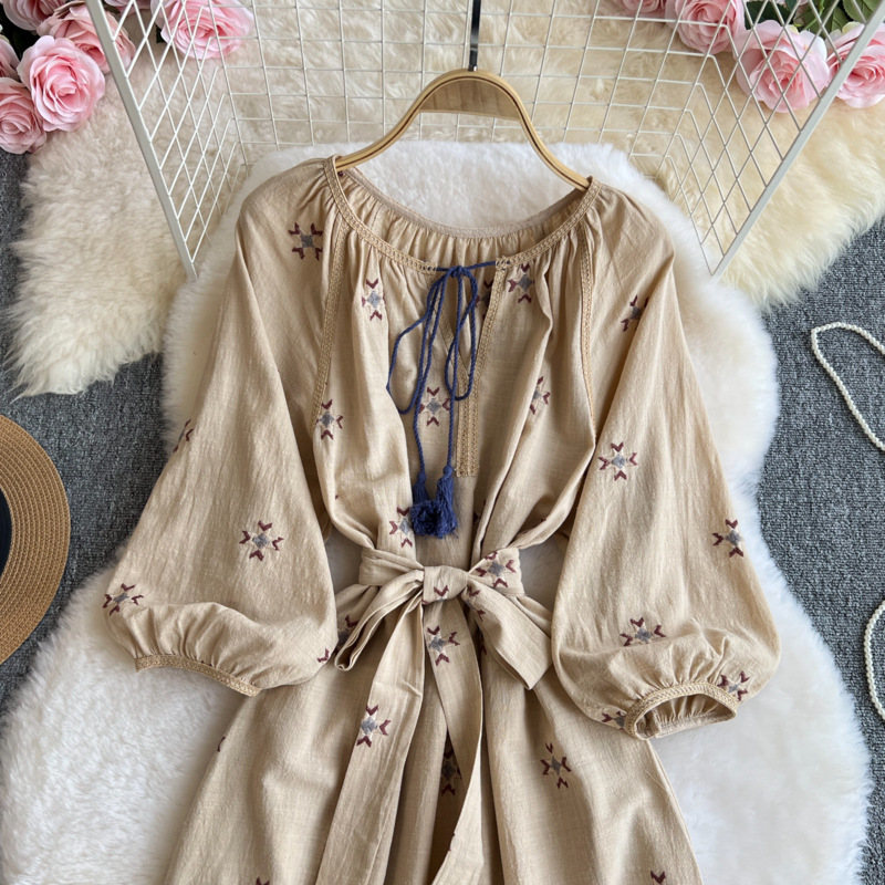 Cotton Linen Waist-controlled One-piece Dress embroidered PC