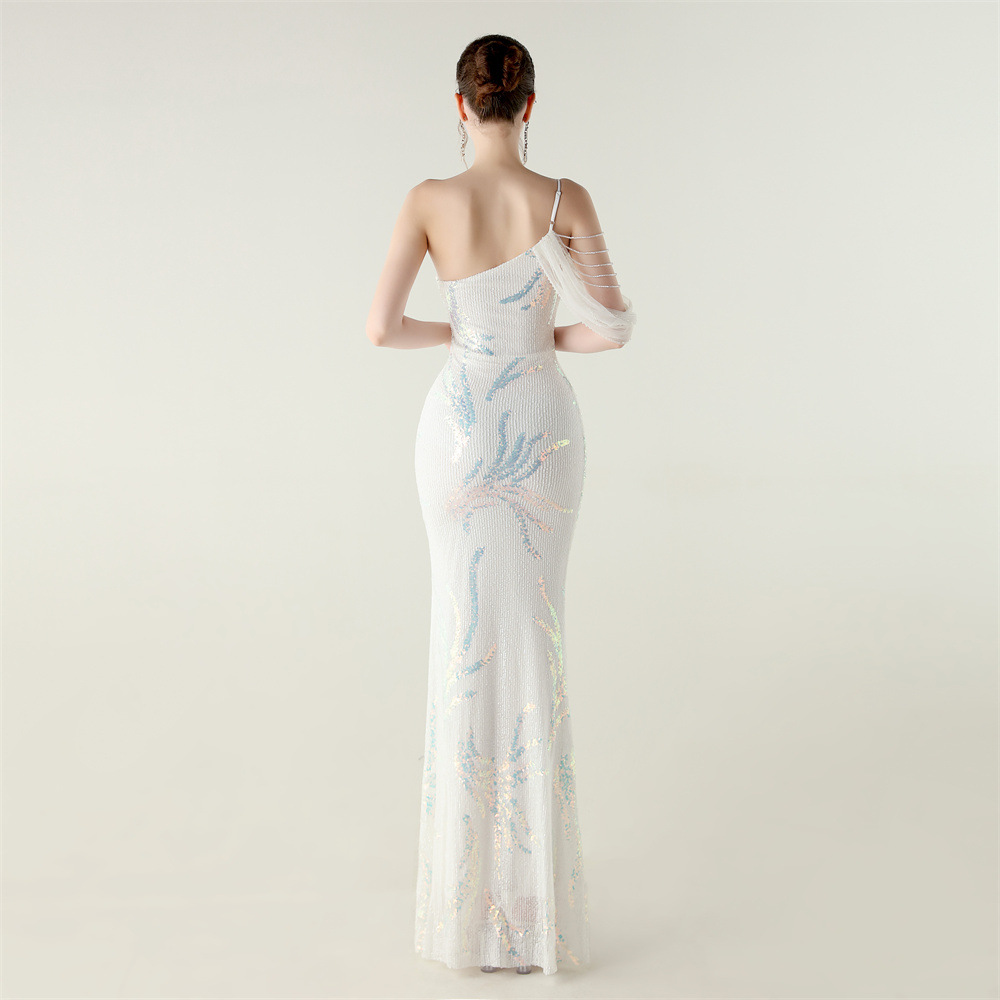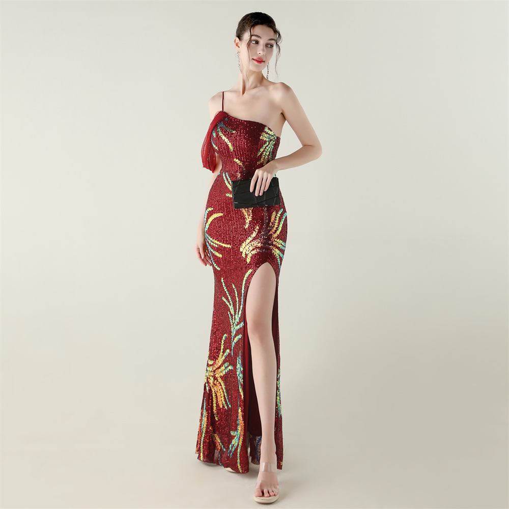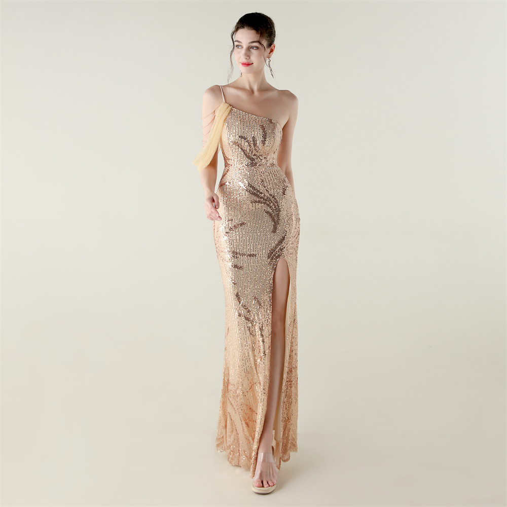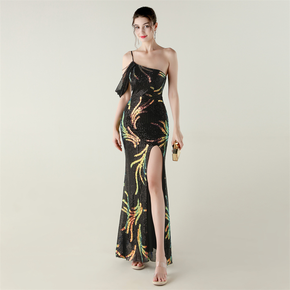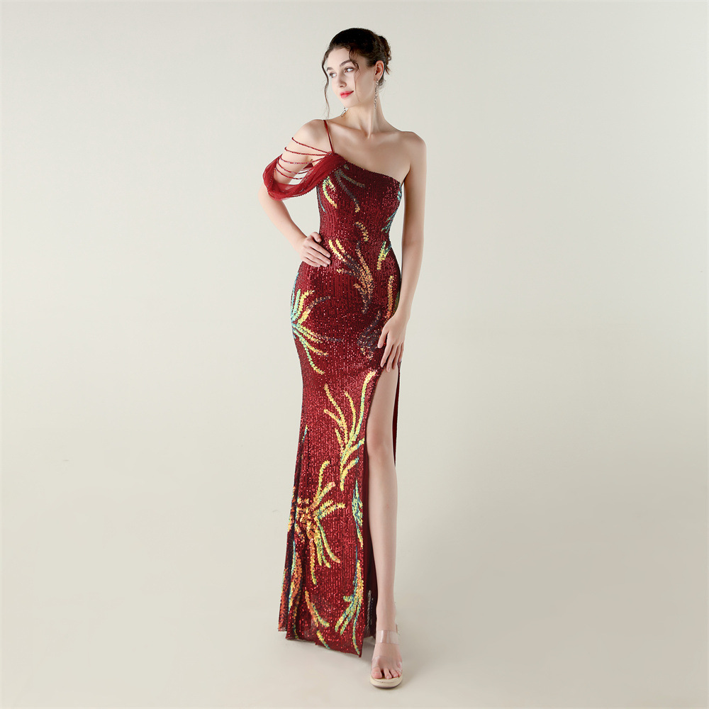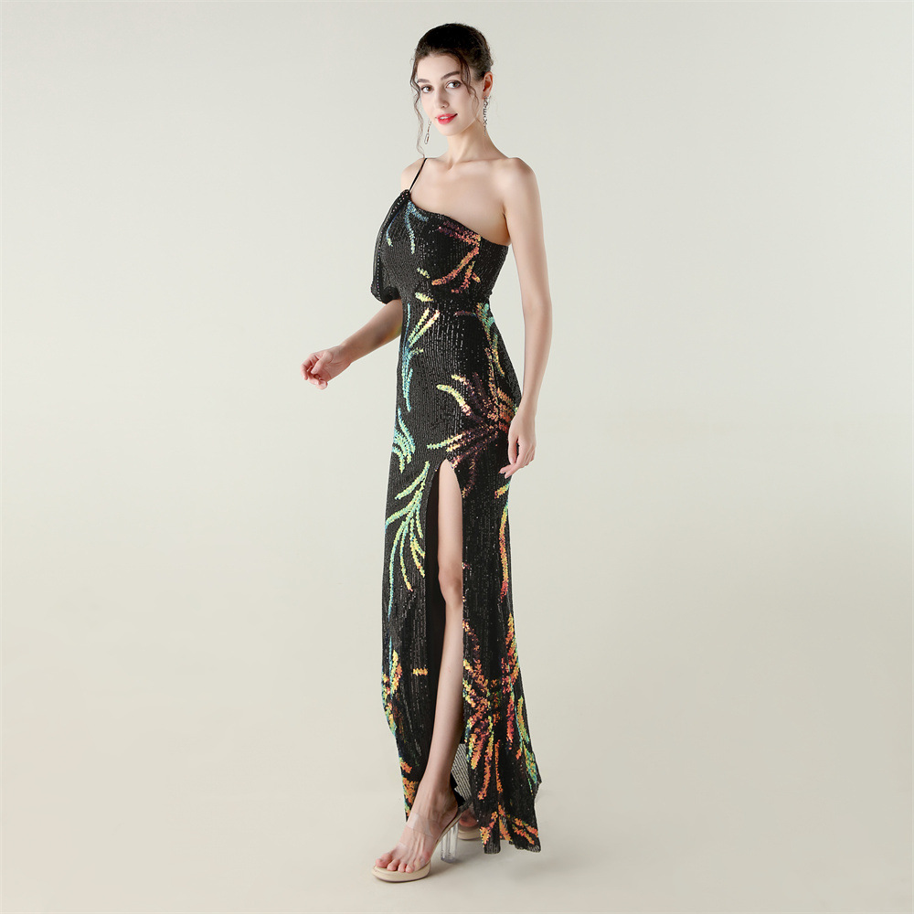 Gauze & Polyester Soft & Slim Long Evening Dress side slit & off shoulder & One Shoulder Sequin patchwork :XXL PC