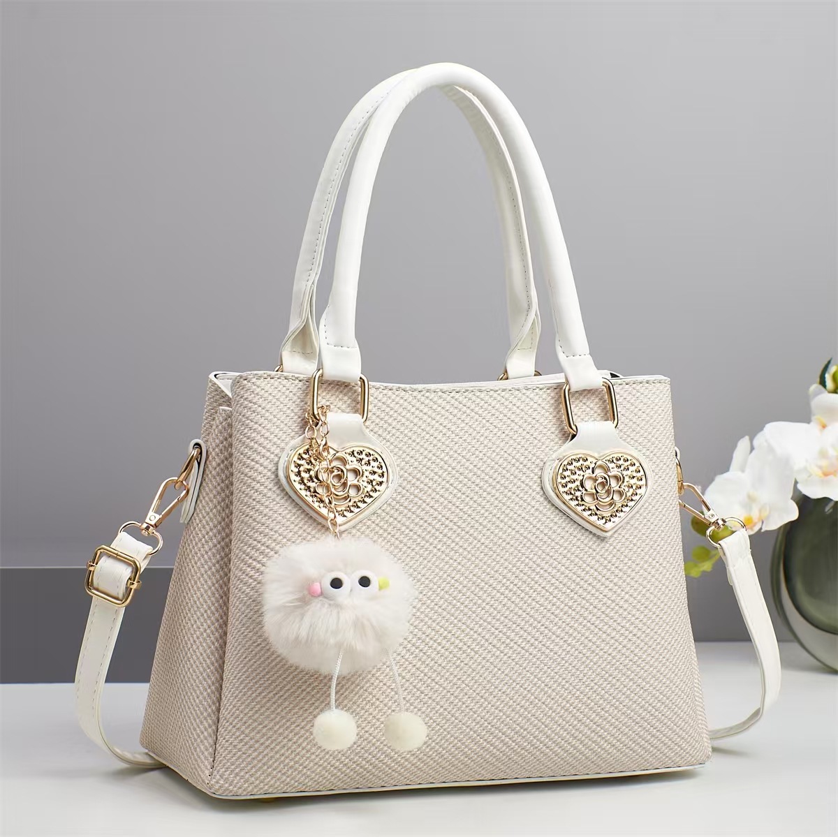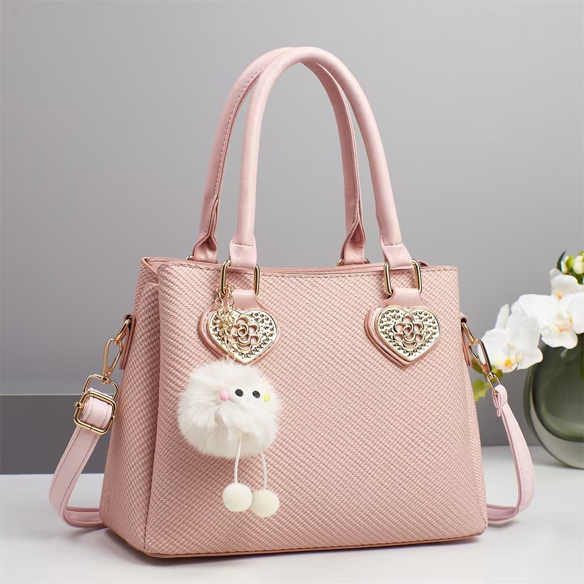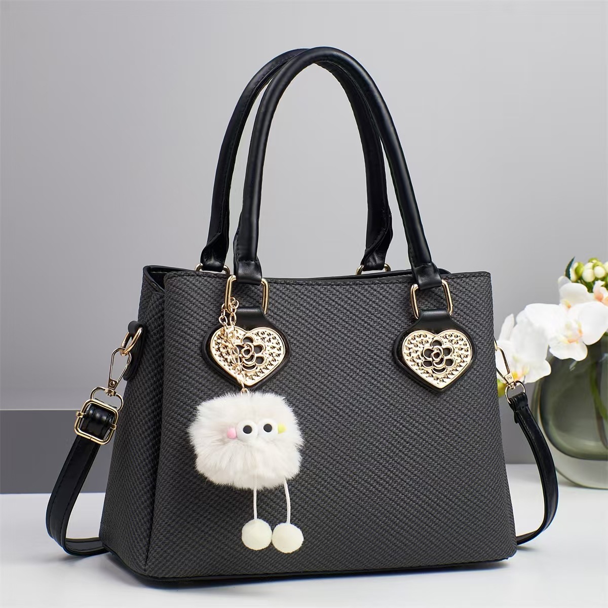 PU Leather Handbag with hanging ornament & attached with hanging strap Solid PC