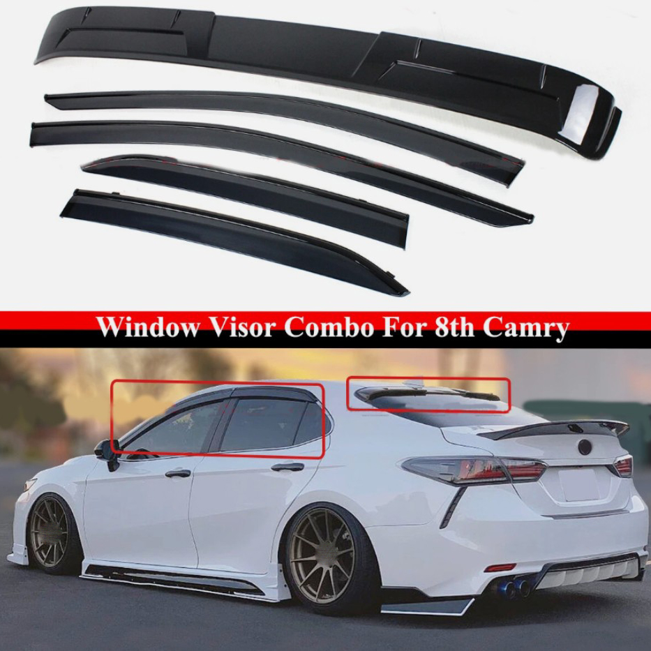 FOR 18-24 TOYOTA CAMRY BLK TRIM WINDOW VISORS W/ CLIP + REAR WINDOW ROOF SPOILER