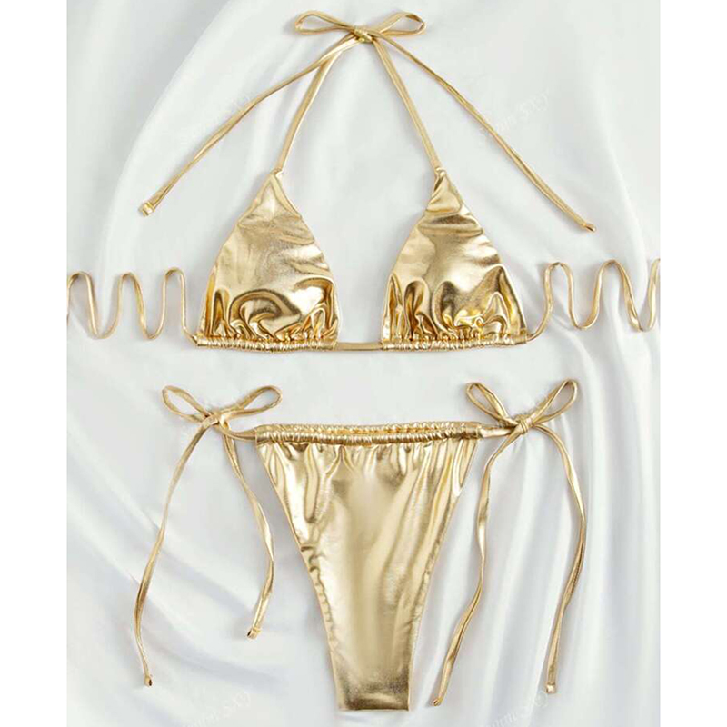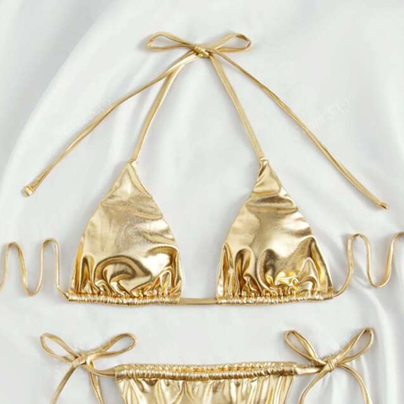Polyester Bikini backless & two piece & padded gold foil print Solid gold Set