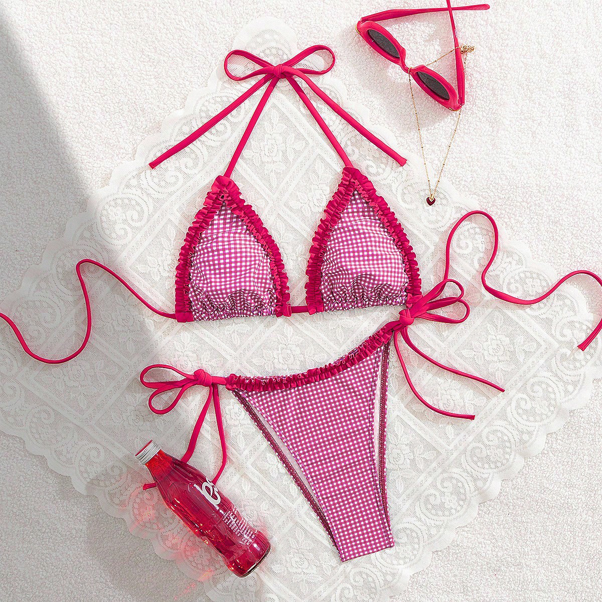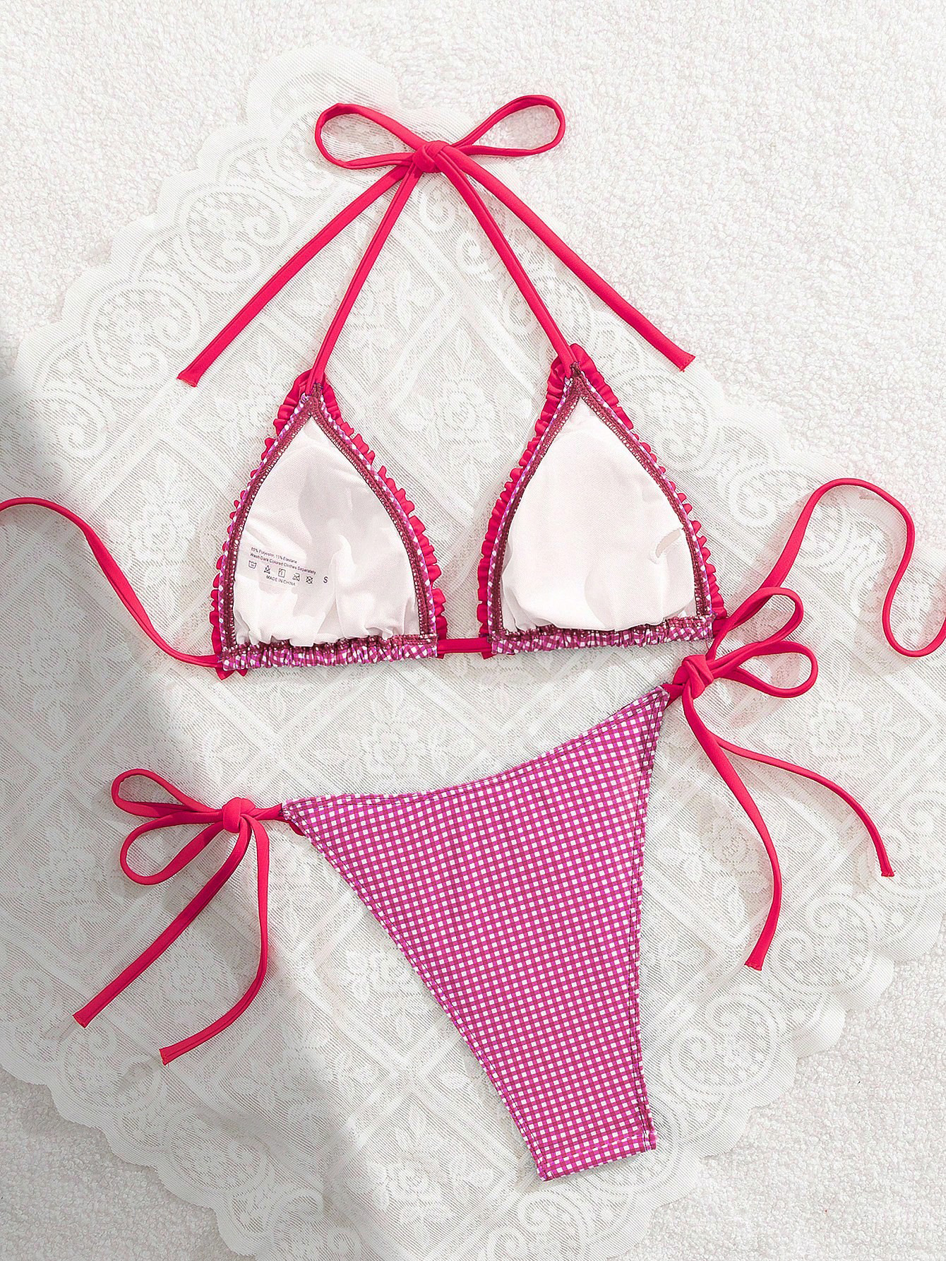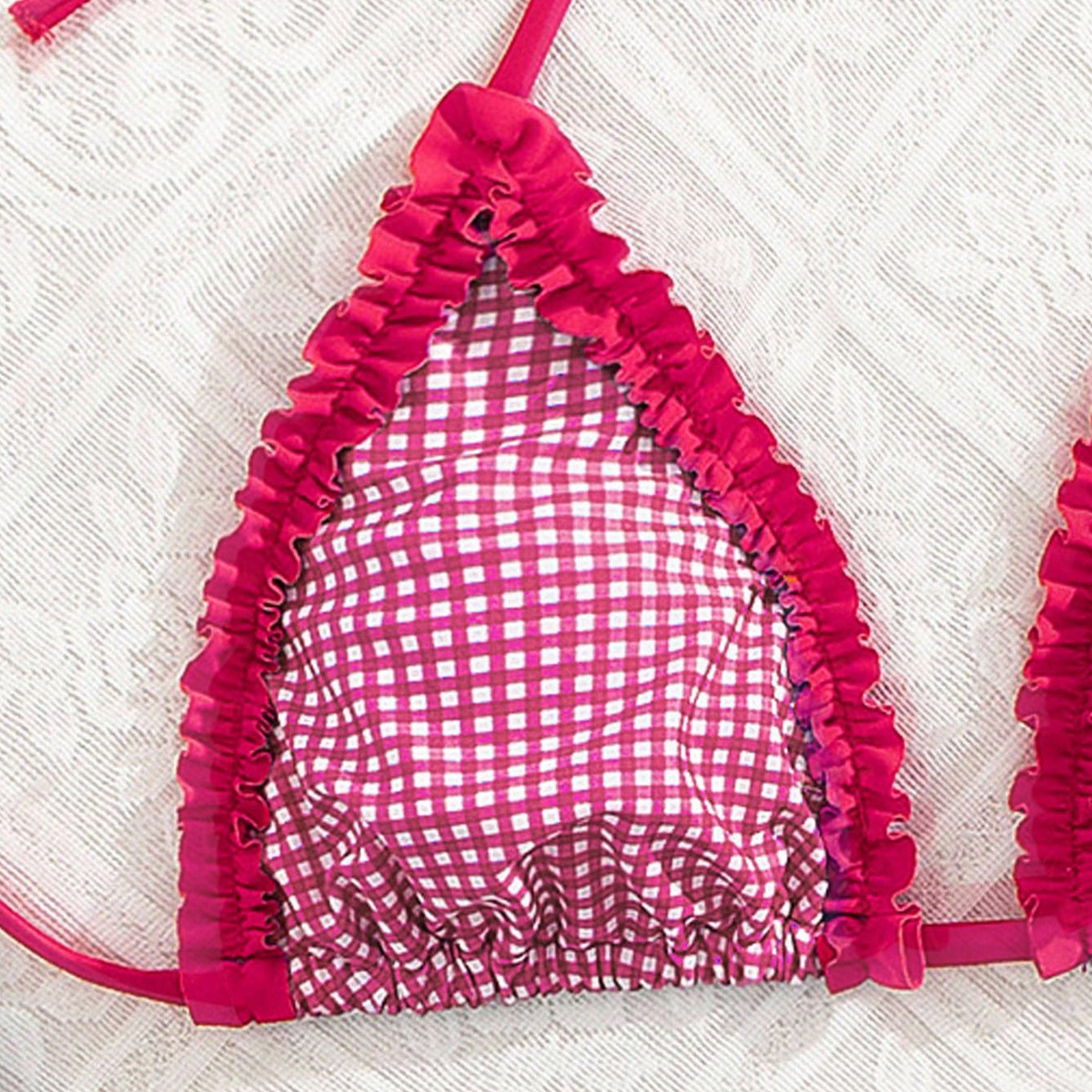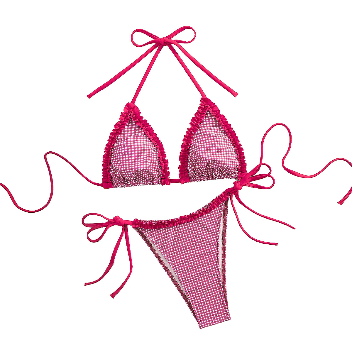 Polyester Bikini backless & padded printed plaid fuchsia Set