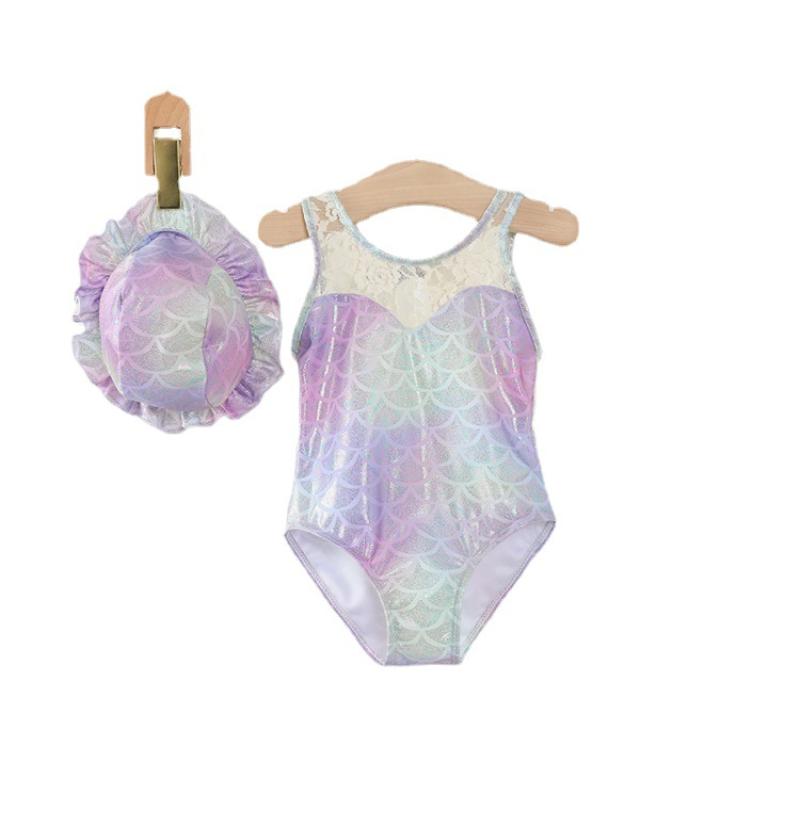 Polyester With hat Girl Kids One-piece Swimsuit printed fish scale pattern multi-colored PC