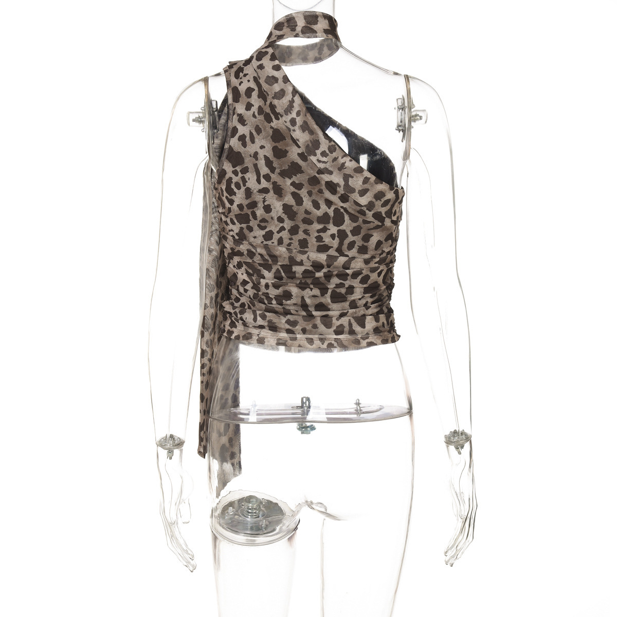 Polyester shoulder slope & Slim Lady One Shoulder Top leopard khaki PC