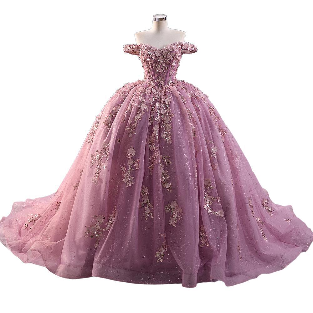 Polyester Off Shoulder Long Evening Dress Gauze floral pink PC