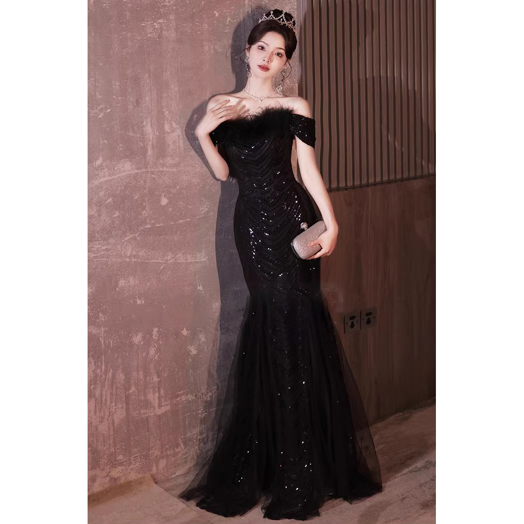 Polyester Off Shoulder & Mermaid Long Evening Dress Sequin patchwork Solid black PC