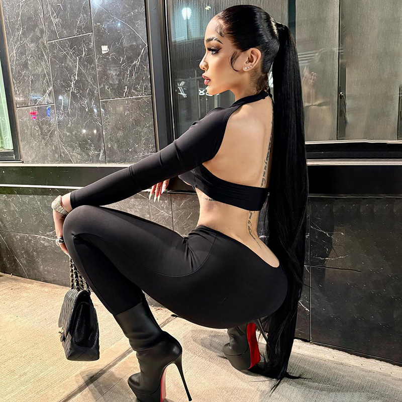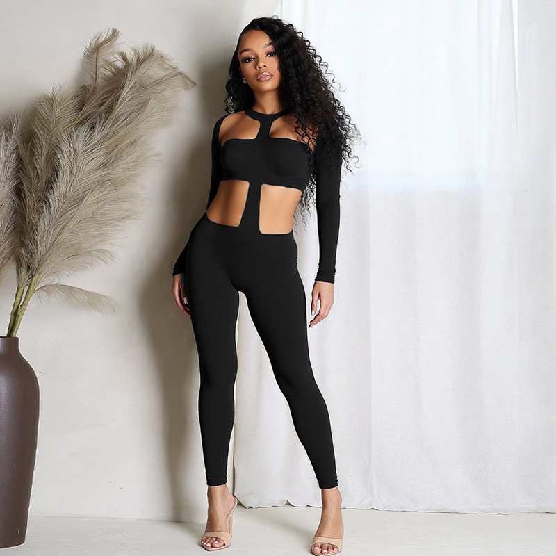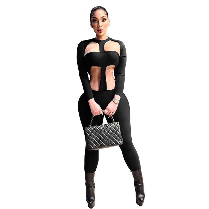 Polyester Long Jumpsuit backless & skinny & hollow Solid black PC