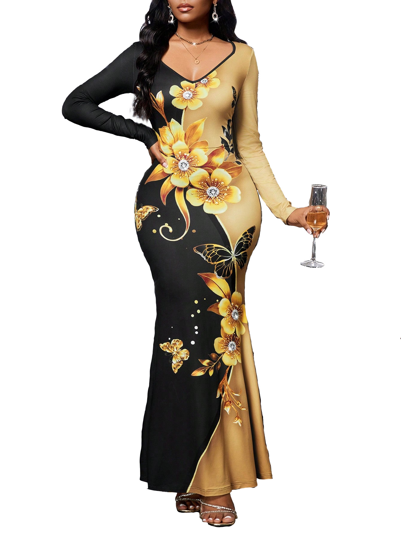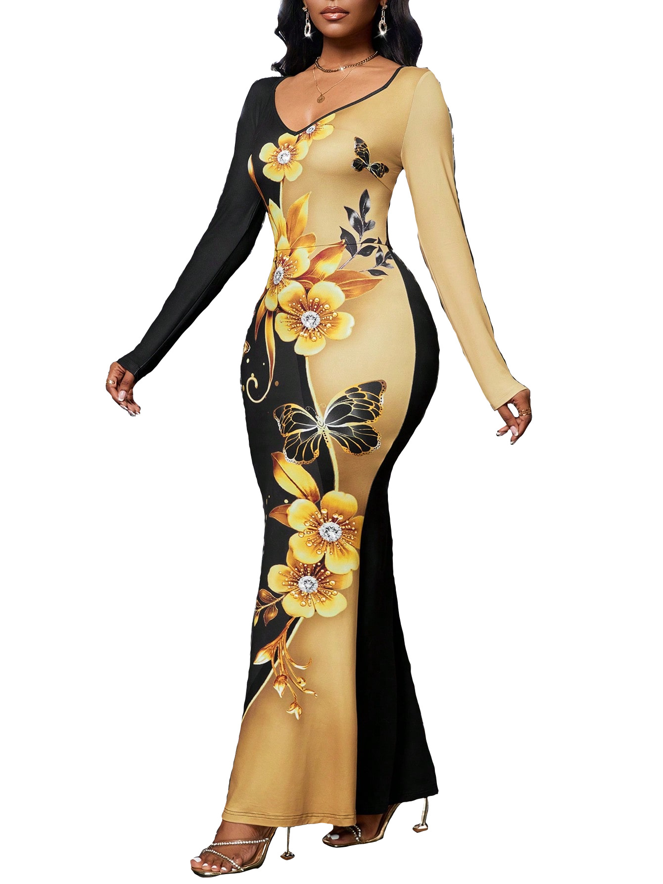 3D digital printing long sleeve V-neck sexy slim dress evening dress