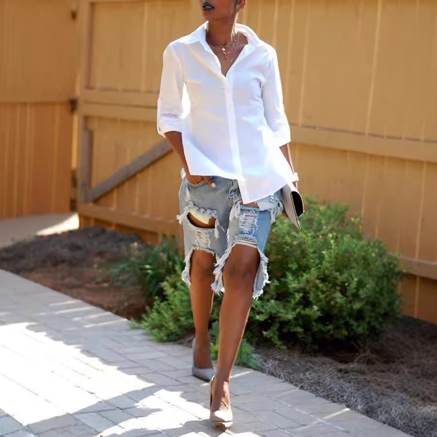 Polyester Ripped Women Jeans Seven Point Pants blue PC