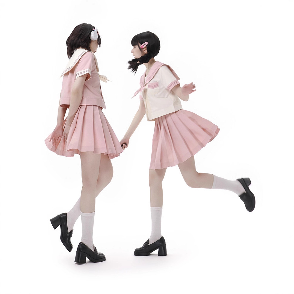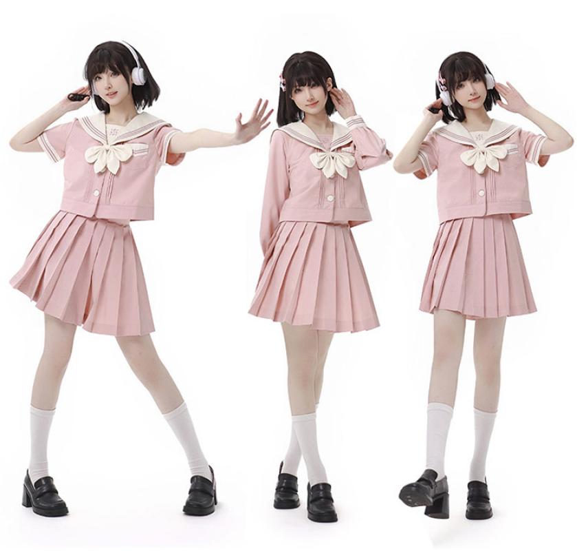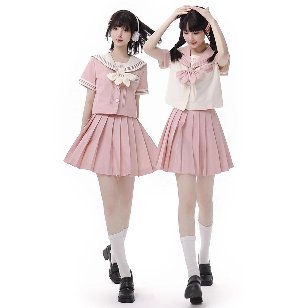 Beige short-sleeved shirt   bow tie  43CM short skirtBeige long-sleeved shirt   bow tie  43CM short skirtPink short-sleeved shirt   bow tie  43CM short skirtPink long-sleeved shirt   bow tie  43CM short skirt