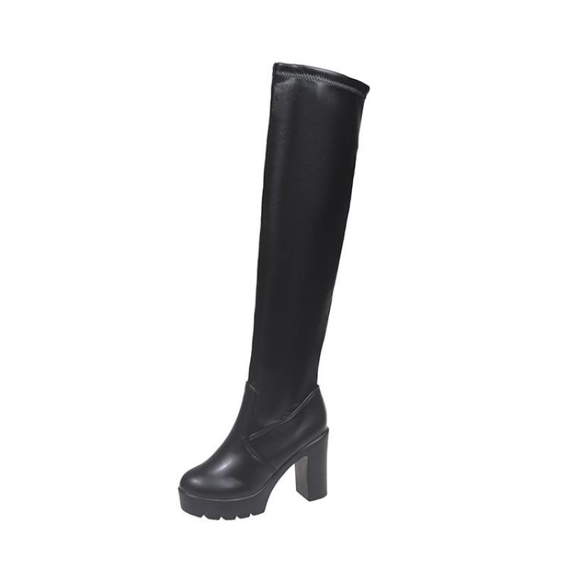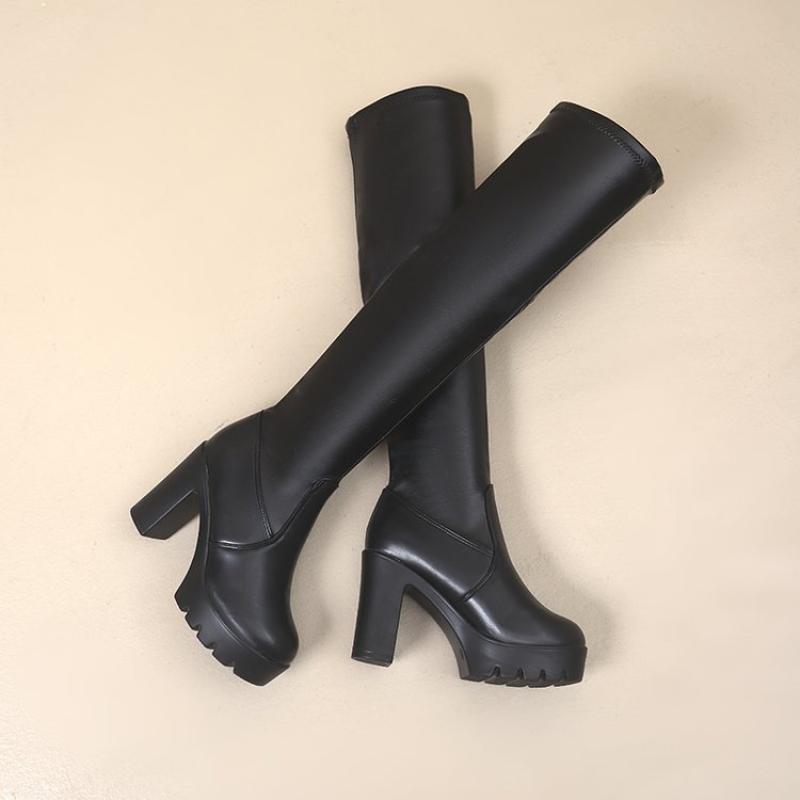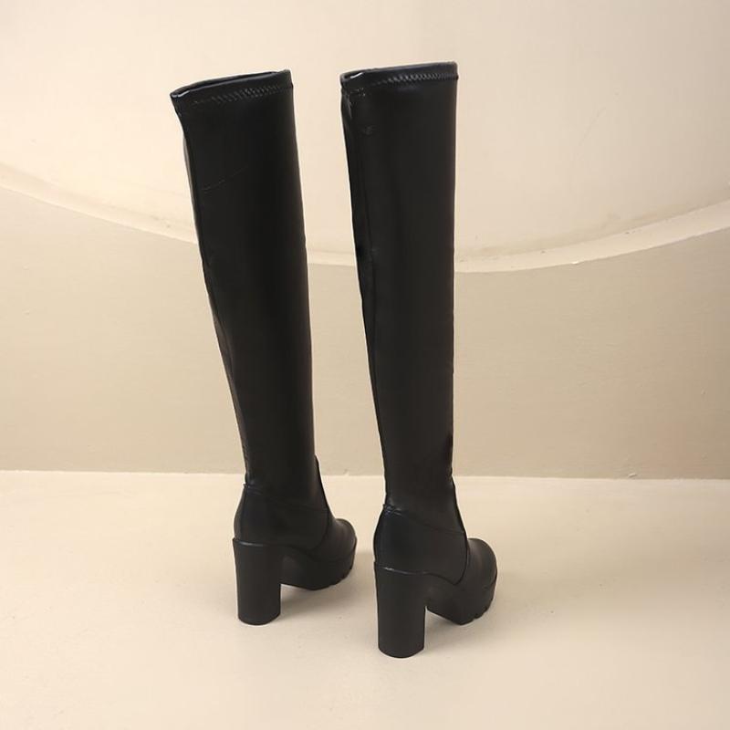 Rubber & PU Leather back zipper & chunky & Platform Knee High Boots & thermal Solid black Pair