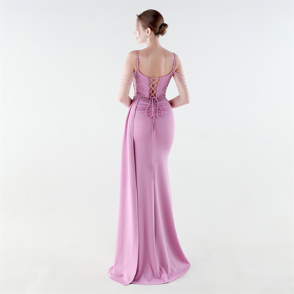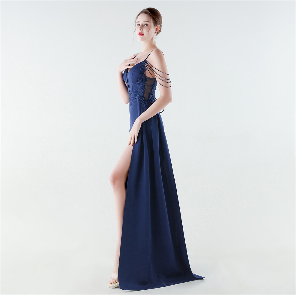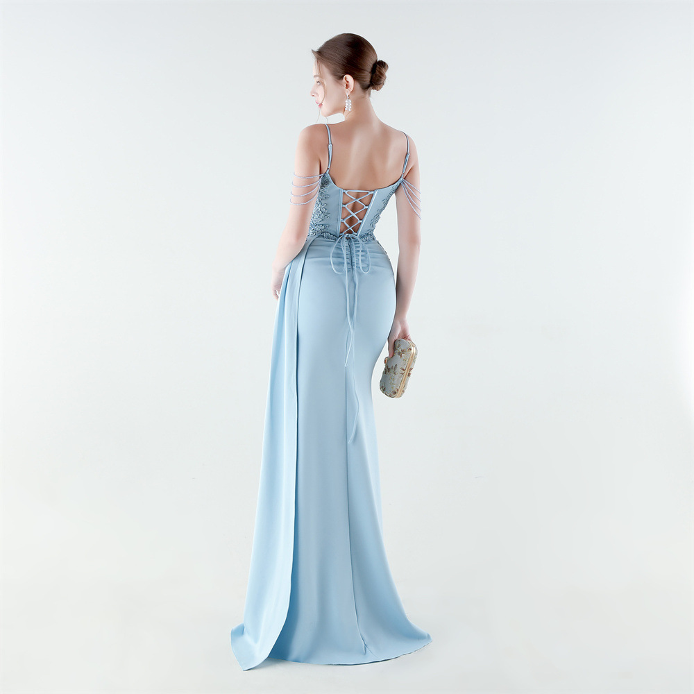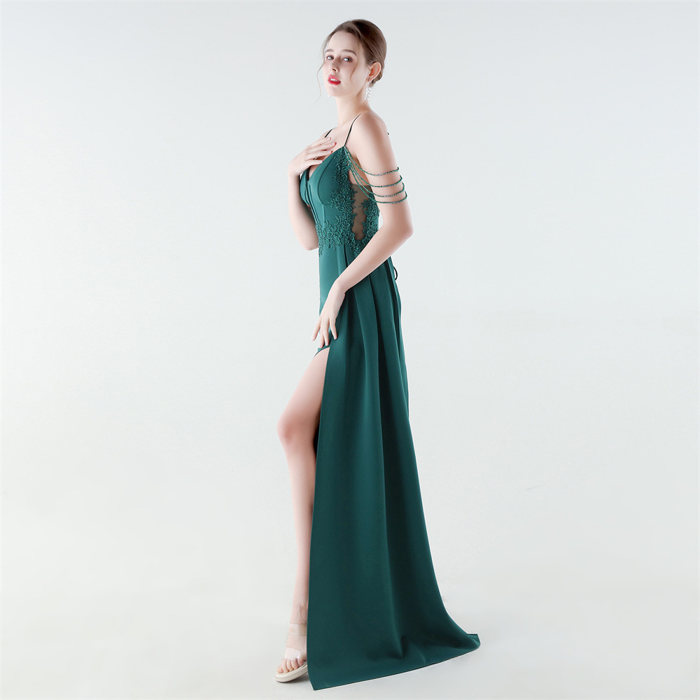 Satin Long Evening Dress side slit & backless & padded iron-on PC