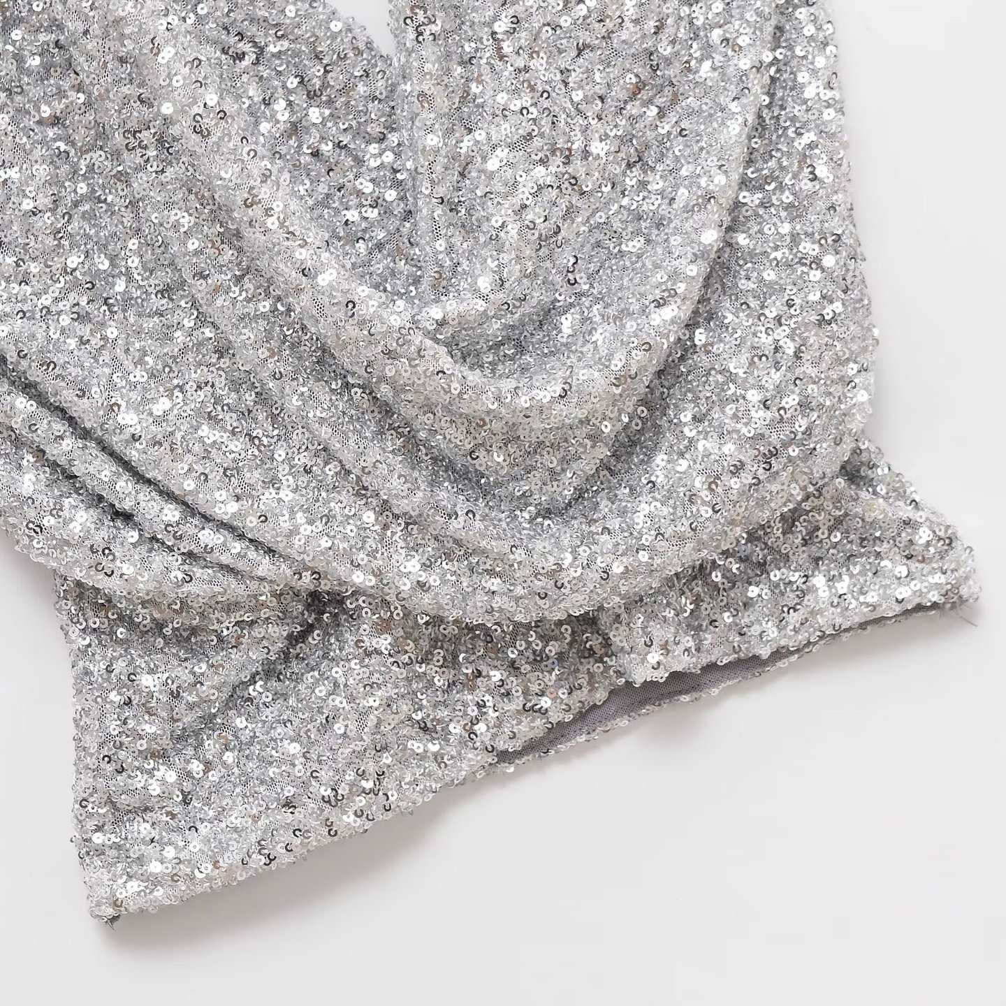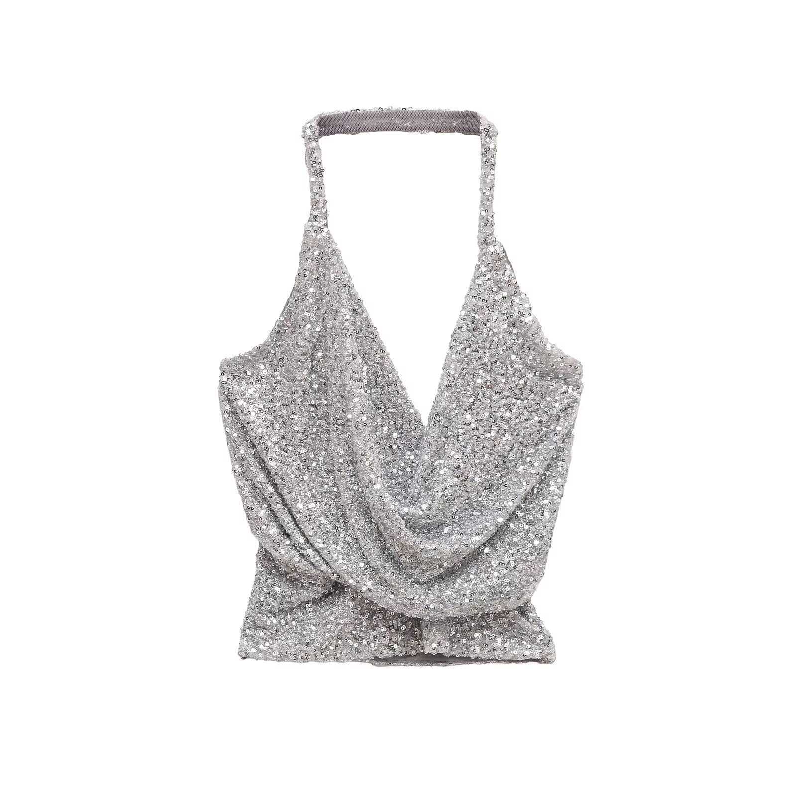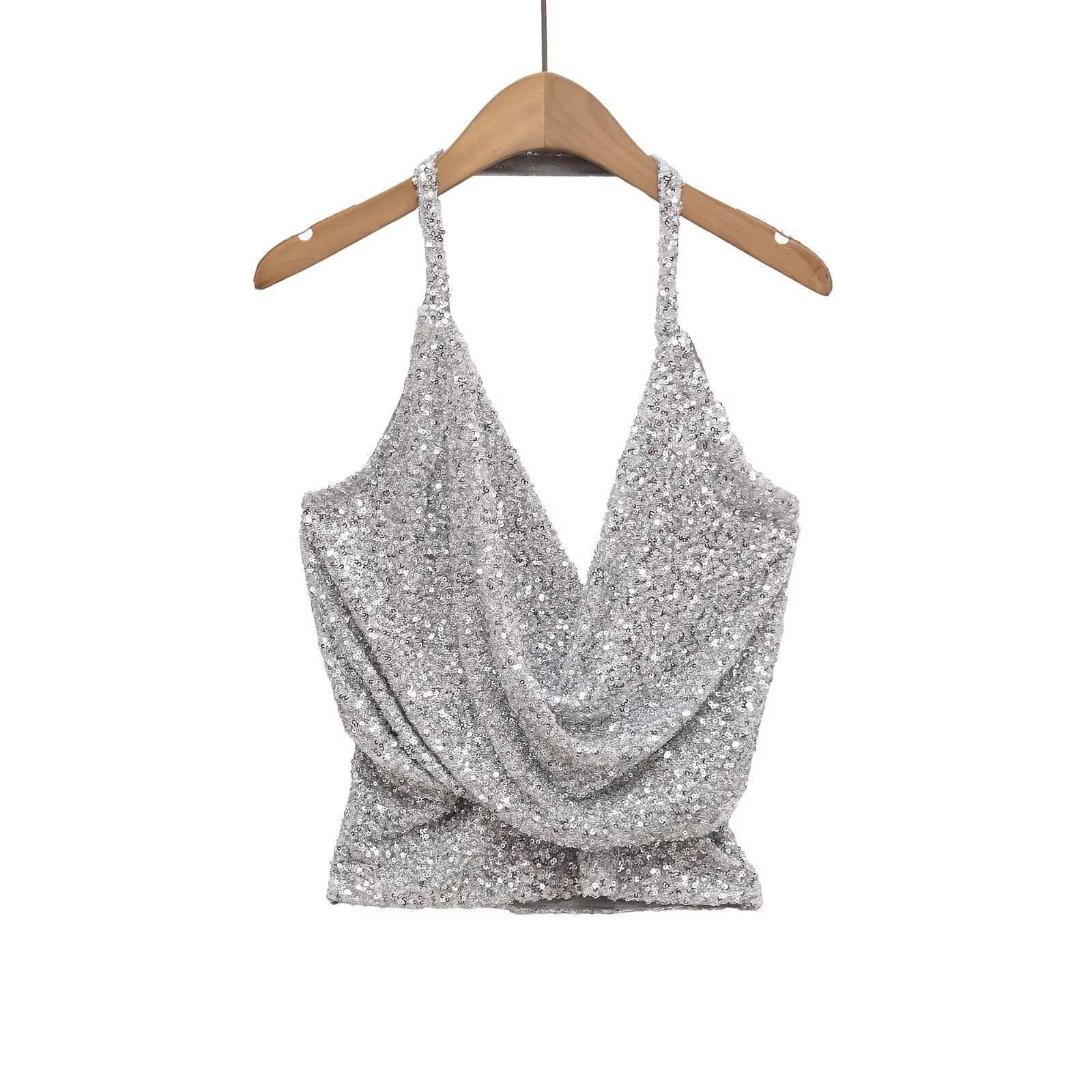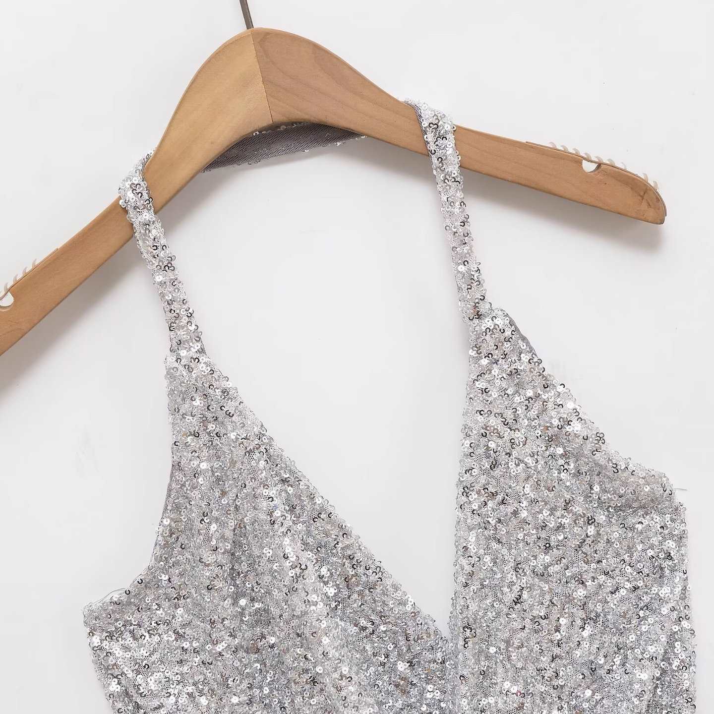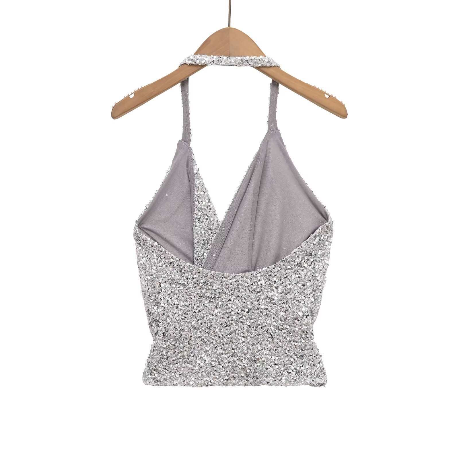 Sequin & Polyester Slim Camisole backless silver gray PC