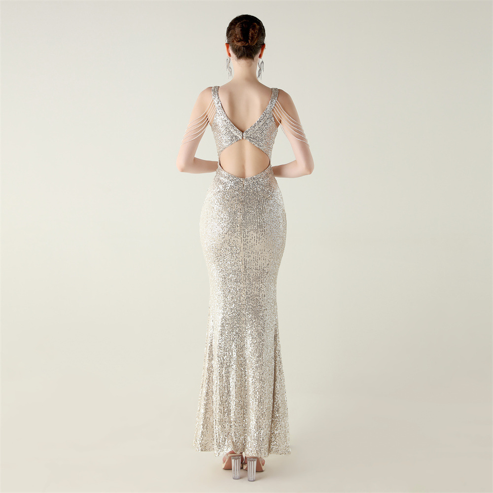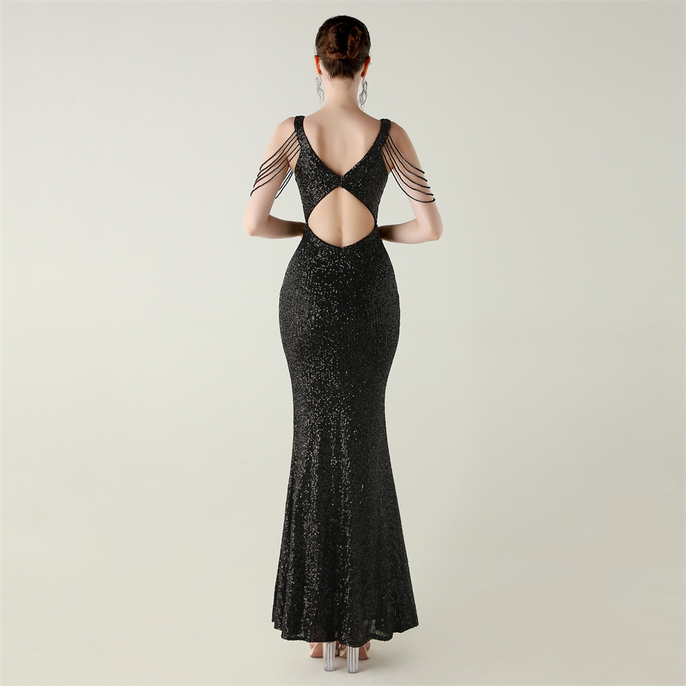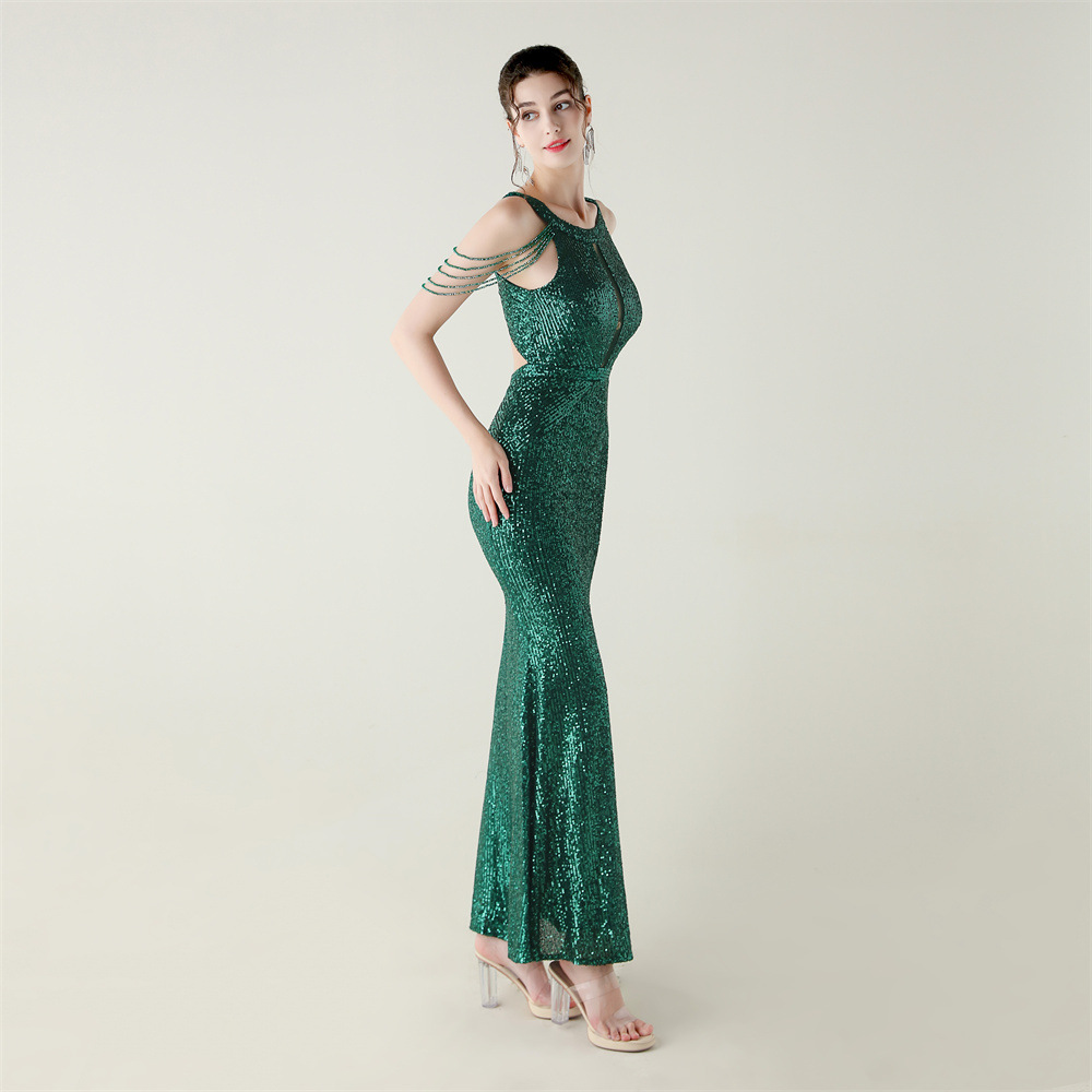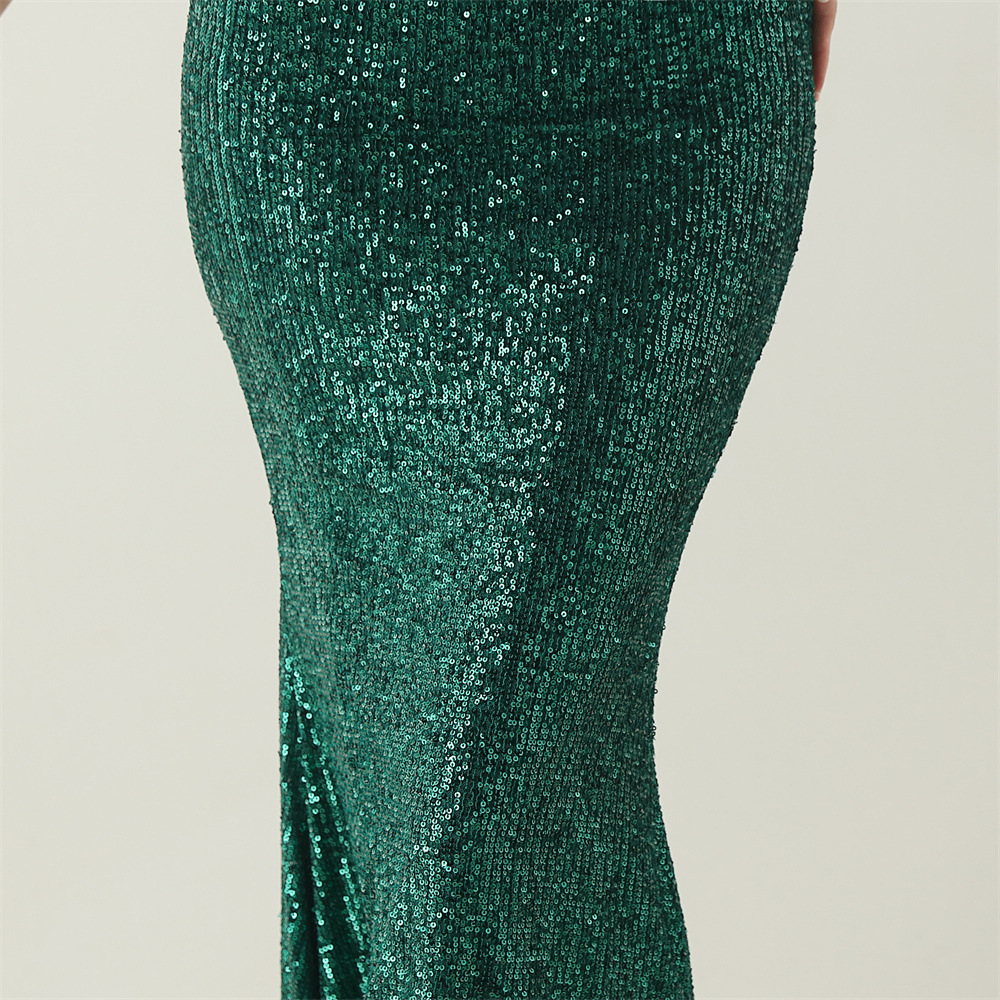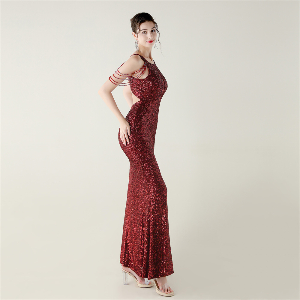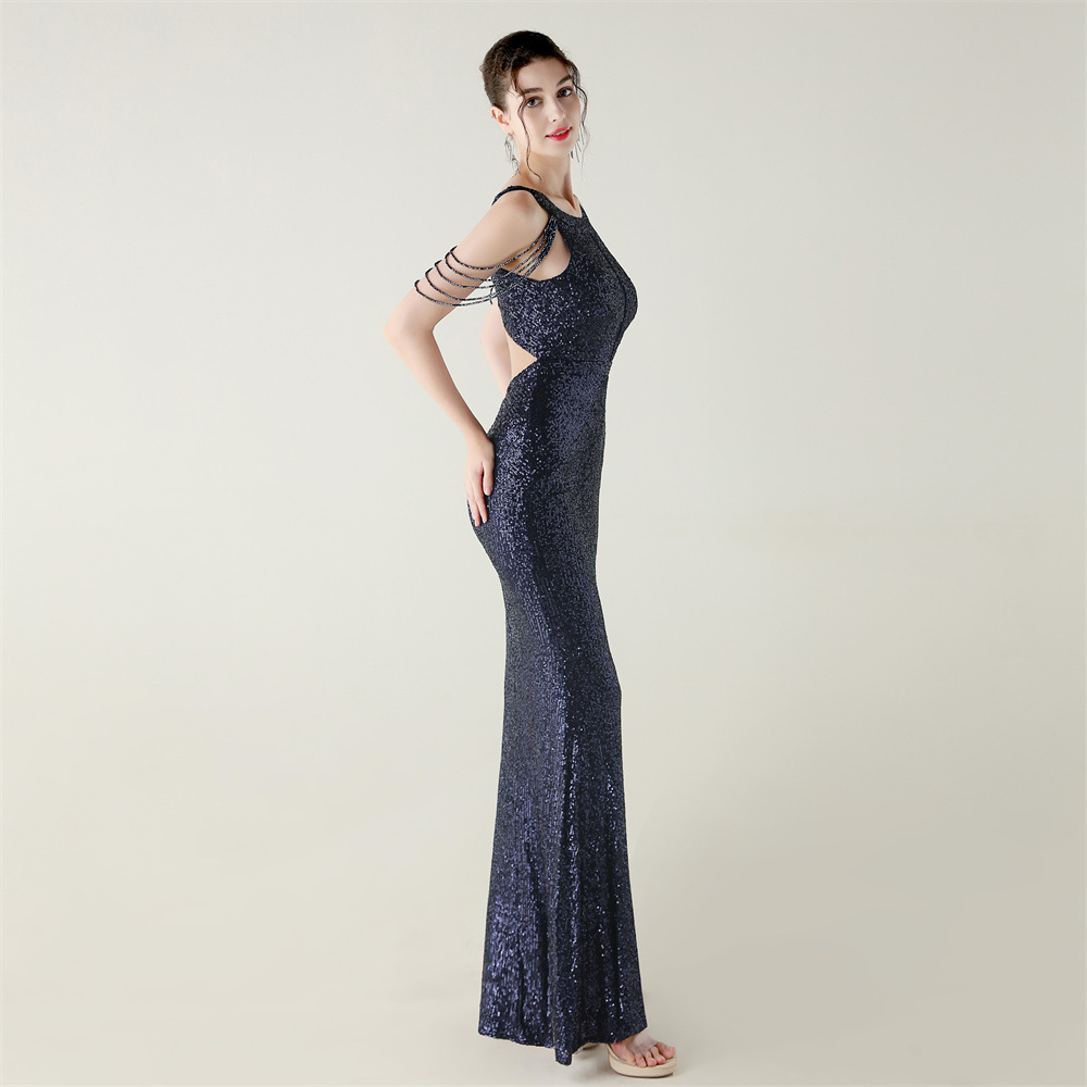 Sequin & Polyester Soft & Slim Long Evening Dress backless & off shoulder patchwork PC