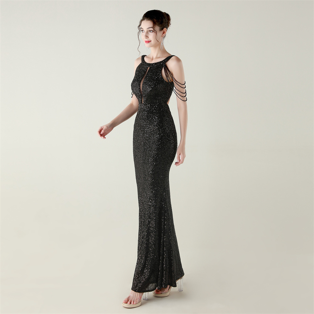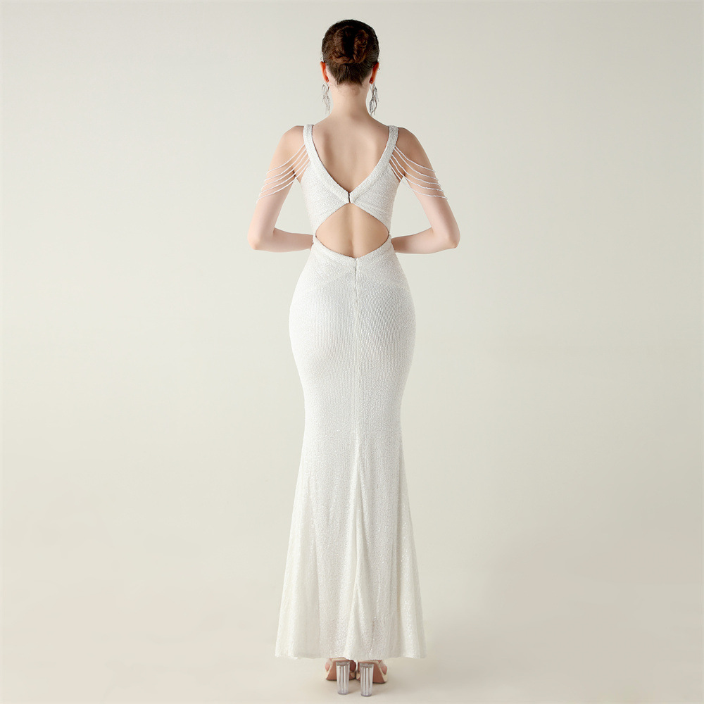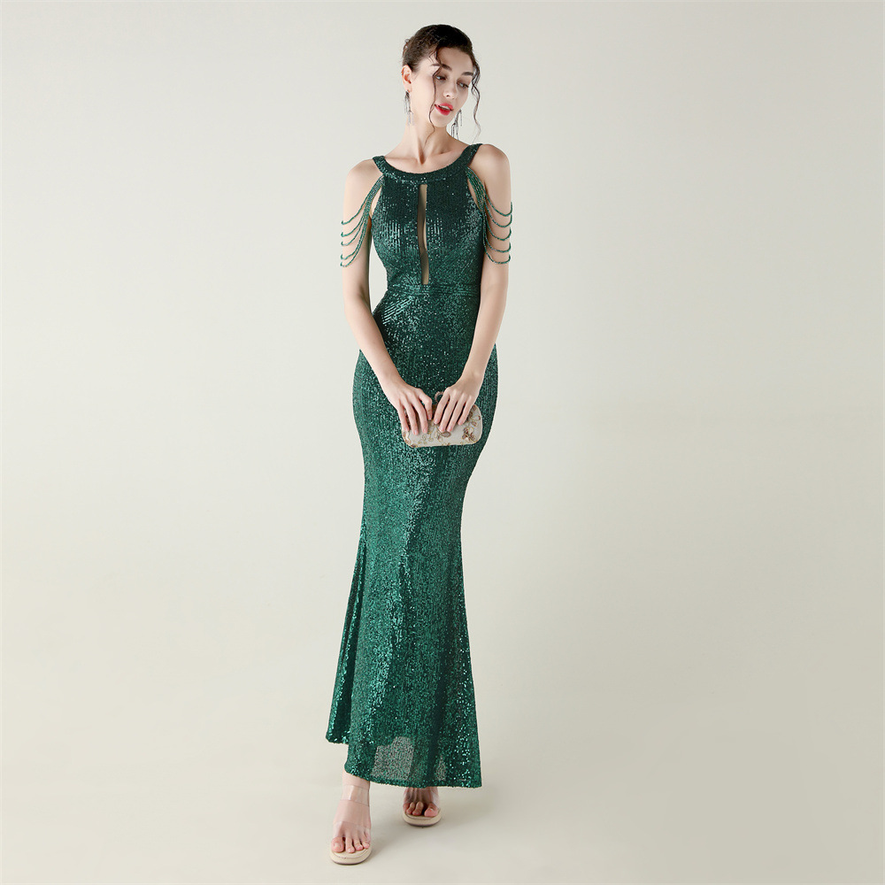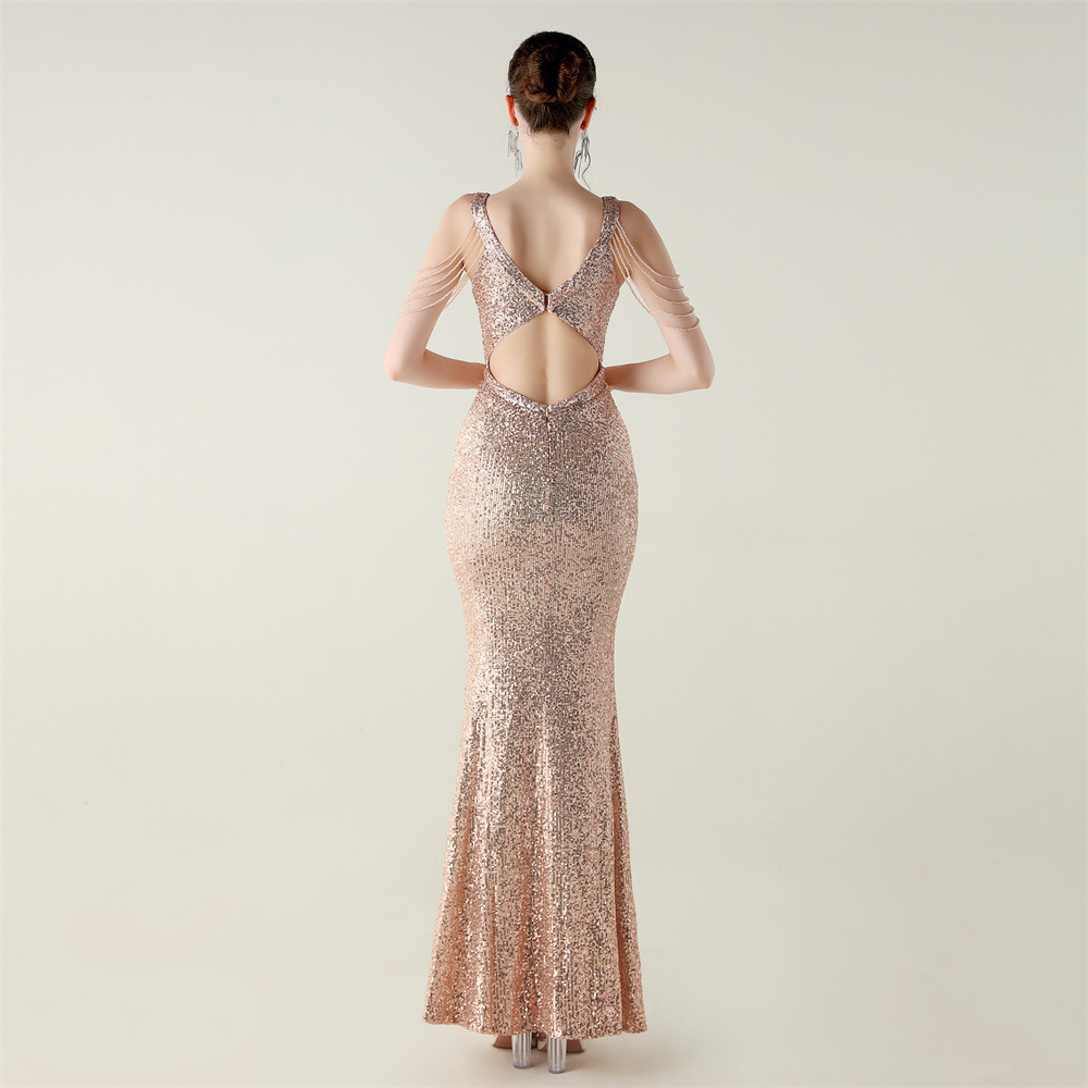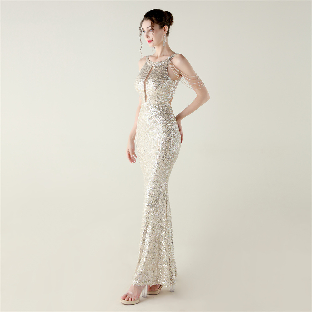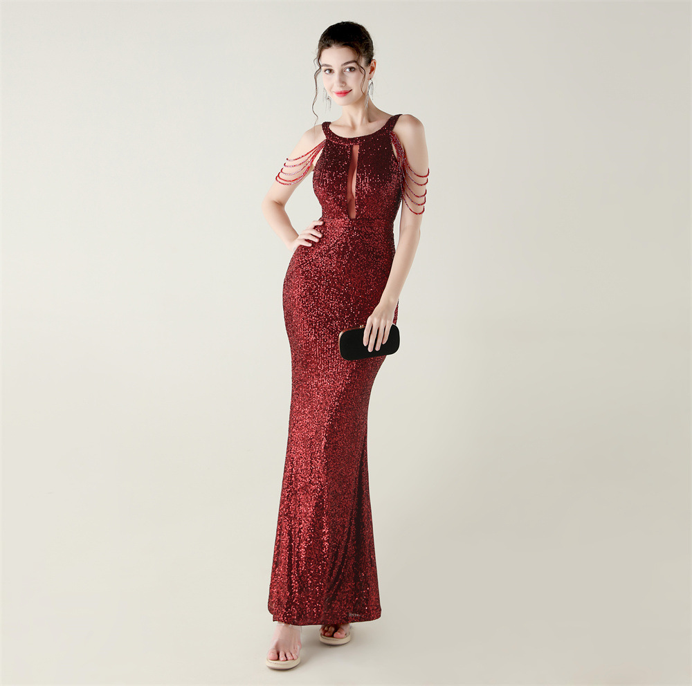 Sequin & Polyester Soft & Slim Long Evening Dress backless & off shoulder patchwork PC