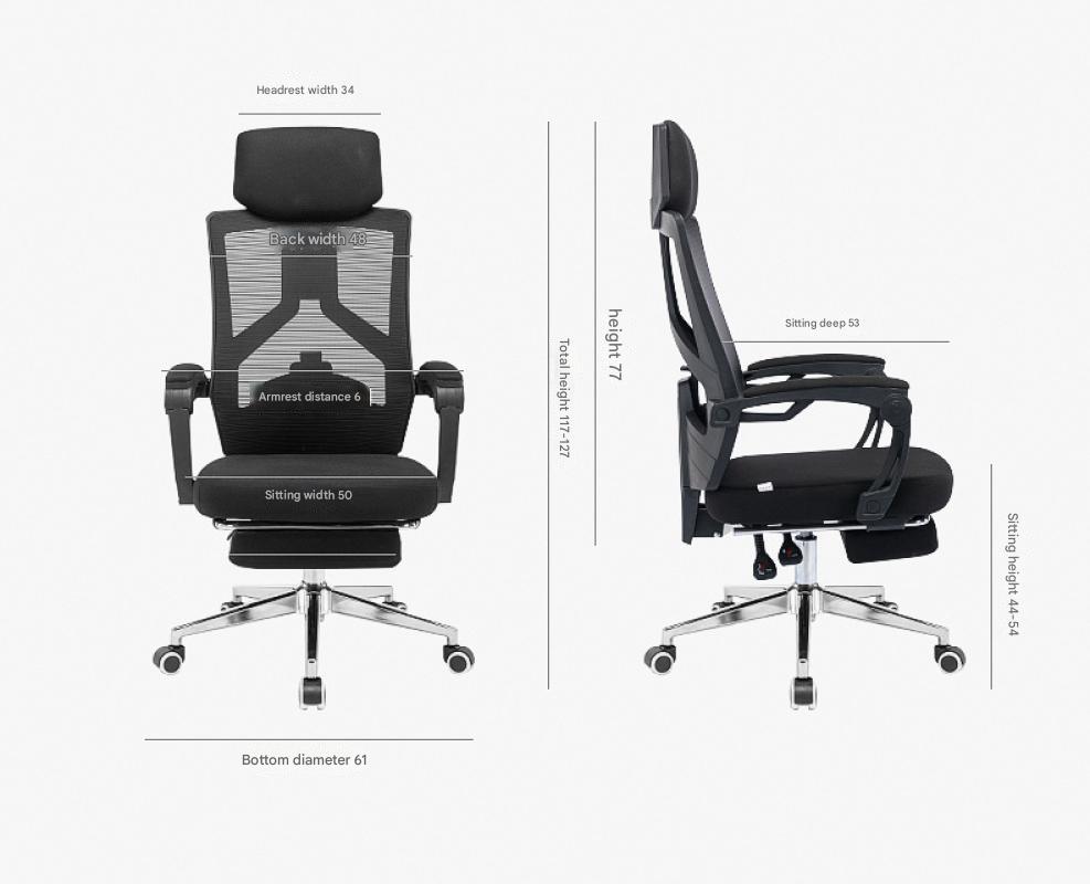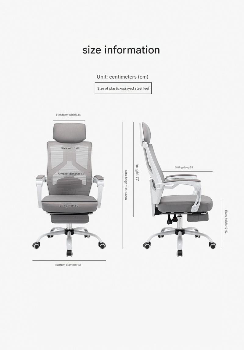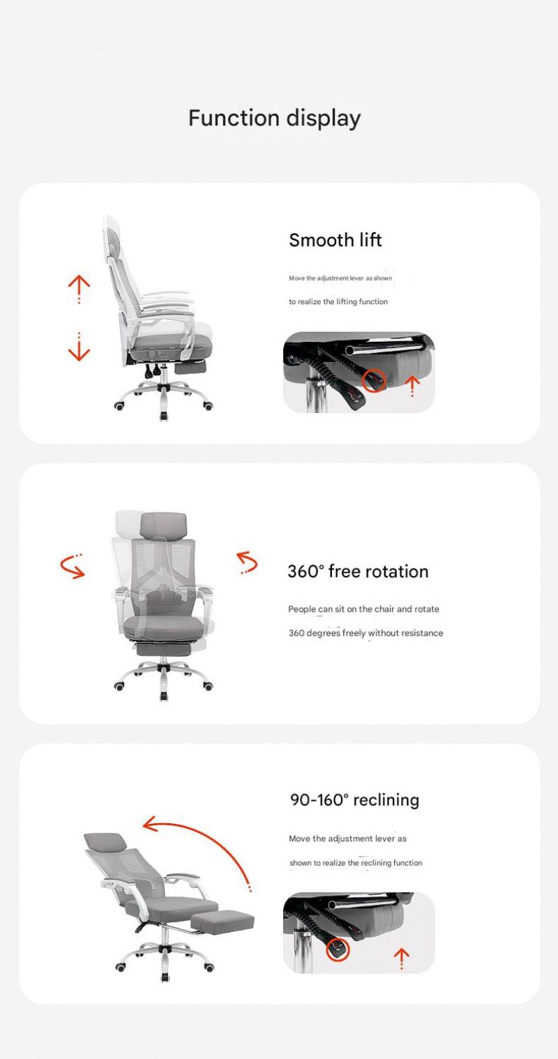 Black frame, black mesh, footrest and black steel feetWhite frame, black mesh plus footrest with white steel feetWhite frame, gray mesh plus footrest with white steel feetBlack frame, black mesh plus footrest and luxury steel feetWhite frame, black mesh plus footrest with luxury steel feetWhite frame, gray mesh and footrest with luxurious steel legs
