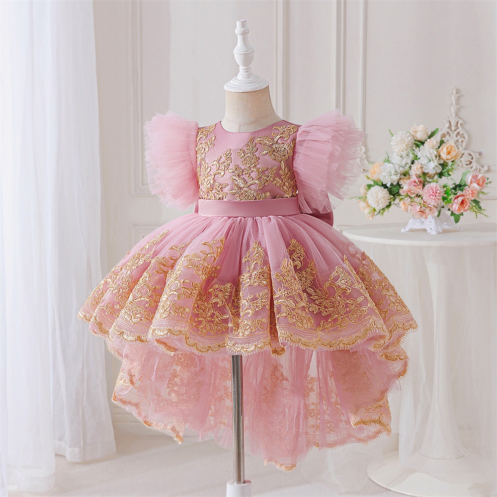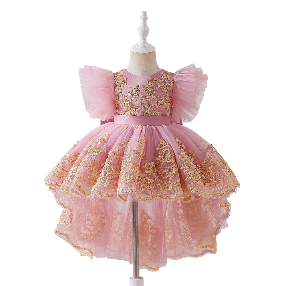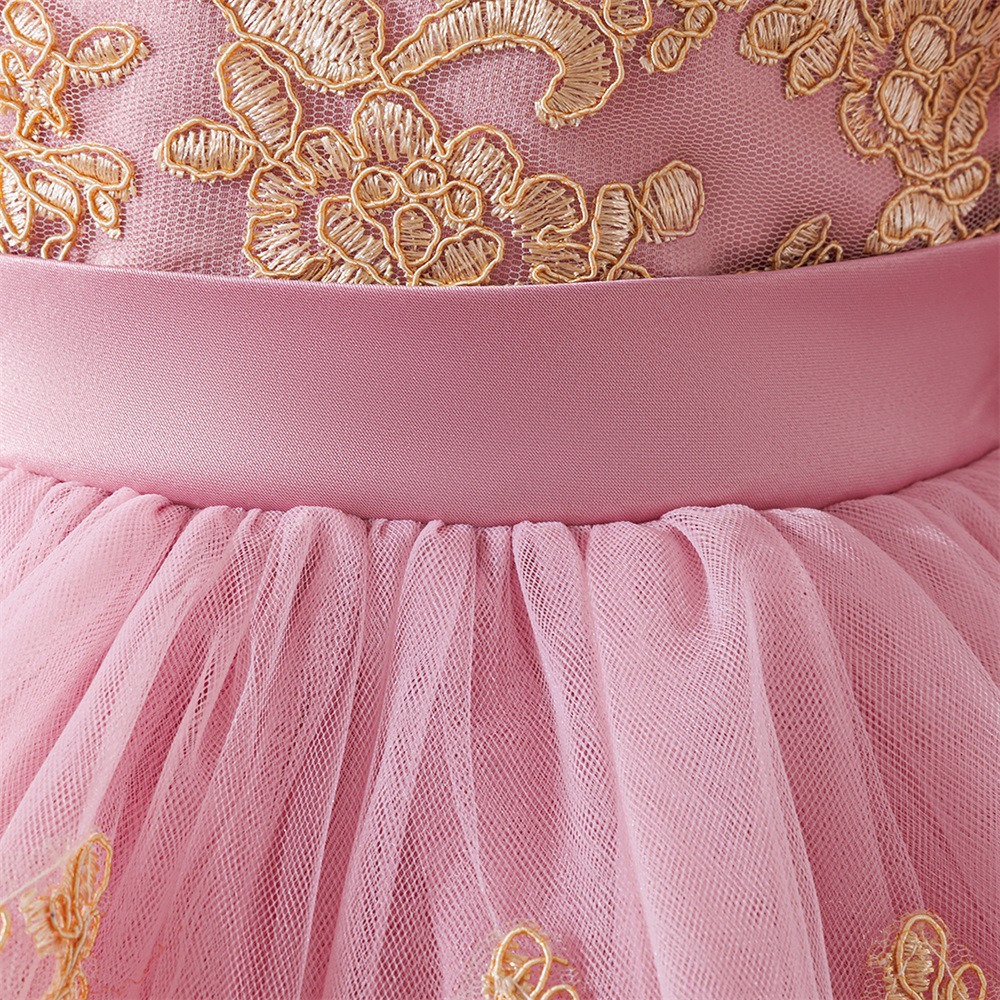 Viscose & Polyester & Cotton Princess Girl One-piece Dress & short front long back embroider pink PC